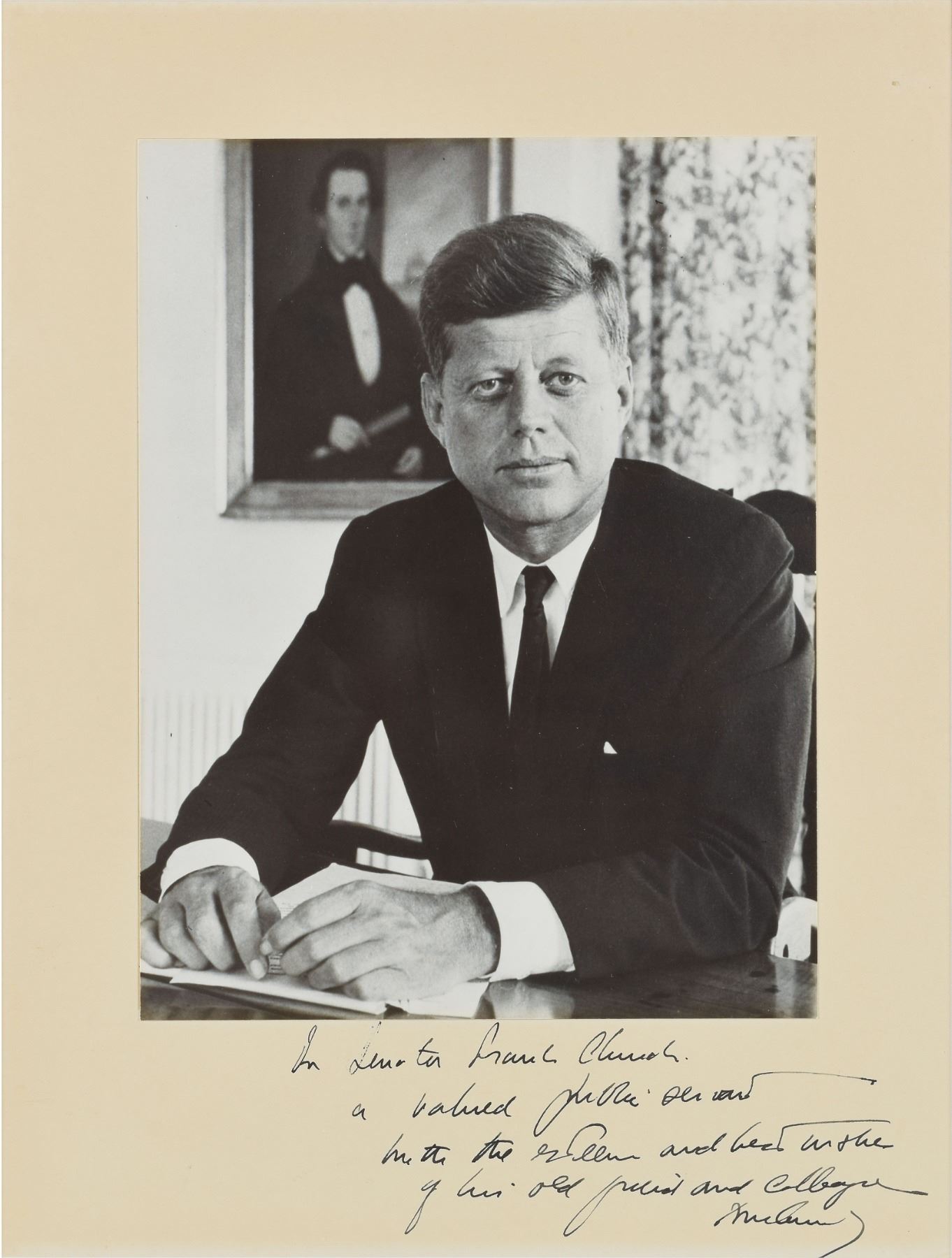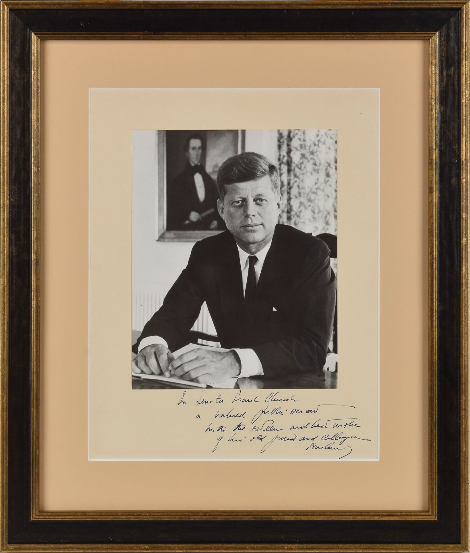 Marvelous matte-finish 7.5 x 9.5 portrait of John F. Kennedy by Alfred Eisenstaedt, signed and inscribed on the mount in fountain pen, "For Senator Frank Church, a valued public servant, with the esteem and best wishes of his old friend and colleague, John Kennedy.” Archivally matted and framed to an overall size of 17 x 20. In fine condition. Accompanied by two photos of Church, one of which bears an autopen signature. Church was a prominent member of the Democratic Party who served as a United States Senator from Idaho from 1957 to 1981, and is perhaps best known for heading the Church Committee, which investigated abuses in the United States Intelligence Community; the Church Committee conducted a limited investigation of the Kennedy assassination, focusing on how well the FBI and CIA supported the Warren Commission. As a young senator, JFK traveled to Twin Falls, Idaho in 1956 to support Church in his second run for a senate seat. The friendship that subsequently developed between the two men is memorialized in this nice inscription to Church as written by the president.
