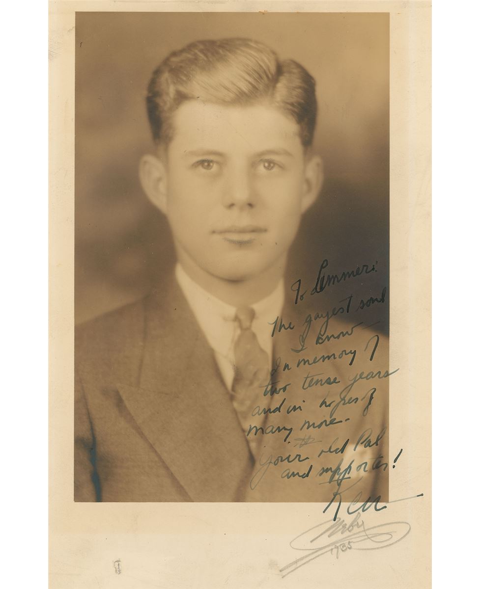 Superlative sepia matte-finish 7 x 11 Choate senior portrait, boldly signed and inscribed in fountain pen, “To Lemmer, The gayest soul I know—In memory of two tense years and in hopes of many more—your Pal and supporter! Ken.” Also signed by the photographer in pencil and dated 1935. Archivally triple-matted and framed to an overall size of 13 x 16.5. In very good to fine condition, with nearly imperceptible pencil shading to JFK’s eyebrows and lower lip and a small indentation to lower border affecting nothing. There is significant surface loss to the upper border edge (easily trimmed if desired) which is perfectly hidden by the tasteful matting to produce a remarkably attractive display, in which 6 x 9.25 of the photo is visible. Accompanied by a full letter of authenticity from PSA/DNA.