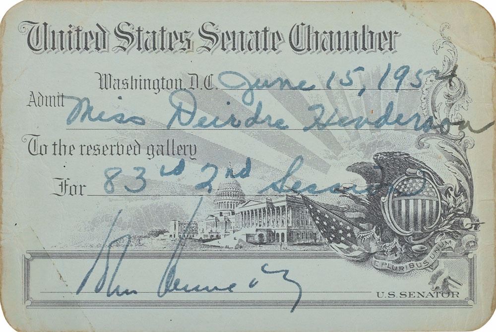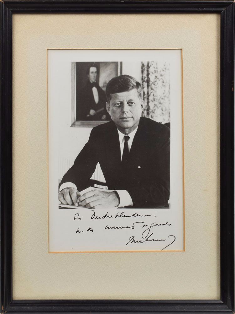 Outstanding matte-finish 6 x 9 portrait of John F. Kennedy by Alfred Eisenstaedt, boldly signed and inscribed in the lower border in fountain pen, "For Deirdre Henderson, with warmest regards, John Kennedy.” Matted and framed to an overall size of 10.25 x 13.75. In fine condition. The renowned photographer took this portrait at JFK’s home in August 1960 after he had received the Democratic nomination for president. Kennedy and his staffers found the image to be so ‘presidential’ that it was used by the White House during his entire administration. The recipient of this particular photograph, Deirdre Henderson, was JFK's research assistant, and she includes a statement of provenance noting that she watched him sign this for her in the Oval Office in 1962. Henderson further states that she subsequently had the signed portrait framed by the White House framer. Also includes a United States Senate Chamber pass issued to Henderson for June 15, 1954, bearing a secretarial Kennedy signature; Henderson notes that this was the first time she met JFK. From the collection of JFK's research assistant, Deirdre Henderson. Accompanied by a letter of provenance from Henderson.