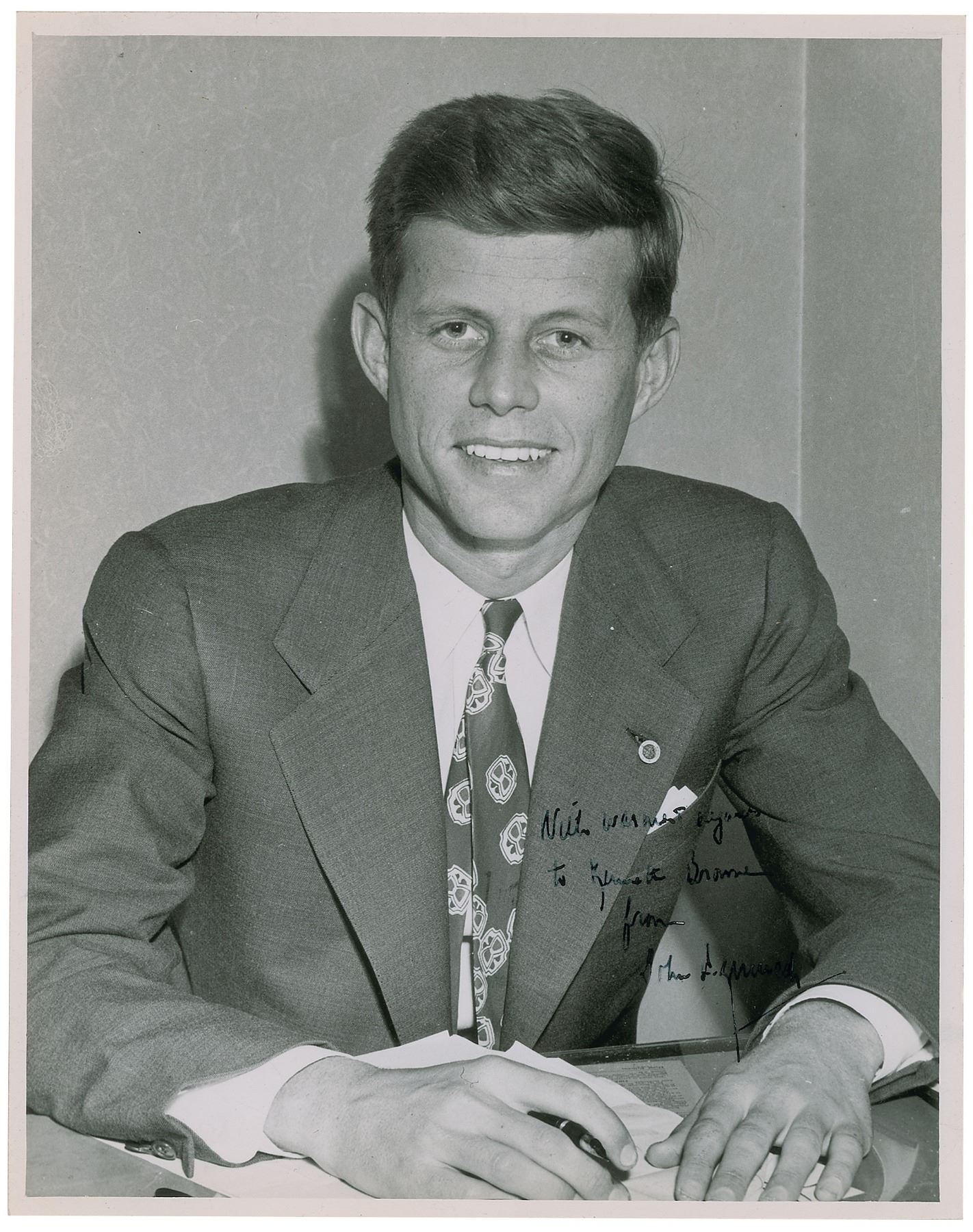 Scarce early glossy 7 x 9 photo of Kennedy from his first year in Congress, signed and inscribed in fountain pen, "With warmest regards to Kenneth Browne, from John F. Kennedy.” Reverse bears an affixed collector's label indicating that it was signed in 1948. In very good to fine condition, with light overall creasing.