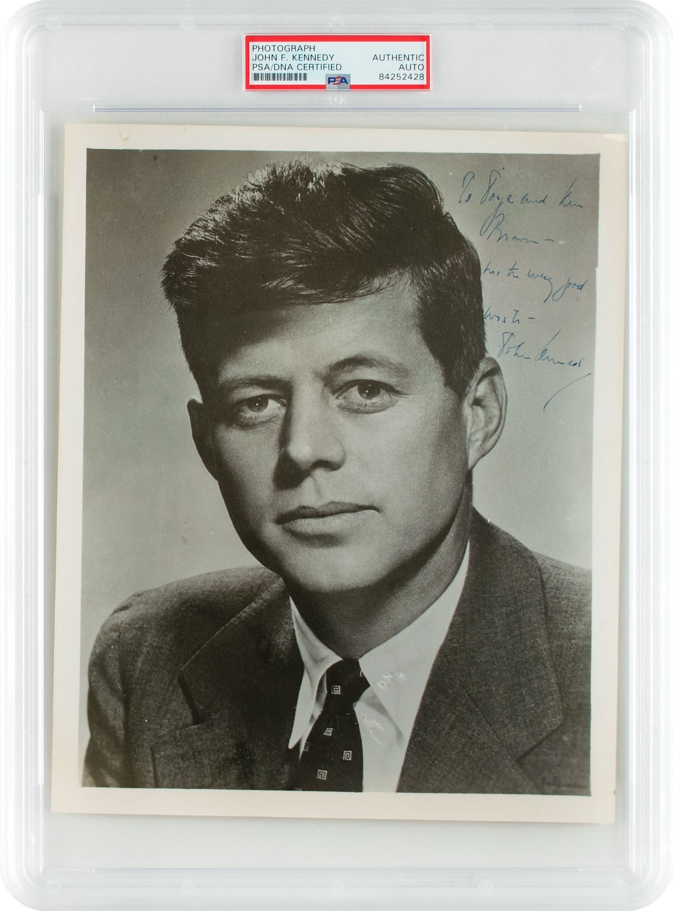 Handsome glossy 8.25 x 10 portrait of Senator John F. Kennedy, signed and inscribed in fountain pen, "To Joyce and Ken Browne—with every good wish—John Kennedy.” In very good to fine condition, with scattered light creasing and surface impressions, a short tear to the right edge, and paperclip impressions to the top edge. Encapsulated in a PSA/DNA authentication holder.