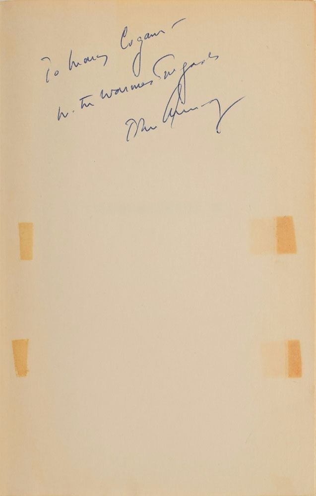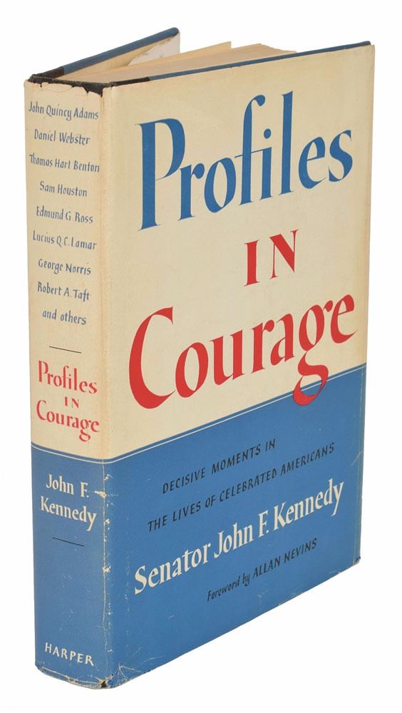 Signed book: Profiles in Courage. Later printing. NY: Harper & Brothers, 1956. Hardcover with dust jacket, 6 x 8.5, 266 pages. Signed and inscribed on the first free end page in blue ballpoint by Kennedy, "To Mary Cogan—with warmest regards, John Kennedy." Autographic condition: fine, with four small old tape stains well beneath the signature. Book condition: VG/VG, with small tears and creases to edges of the dust jacket. The consignor notes that the recipient, Mary Cogan, had been a volunteer on Kennedy's senatorial campaign, and obtained this signature during one of Kennedy's 1956 appearances in Springfield, Massachusetts, where she lived.