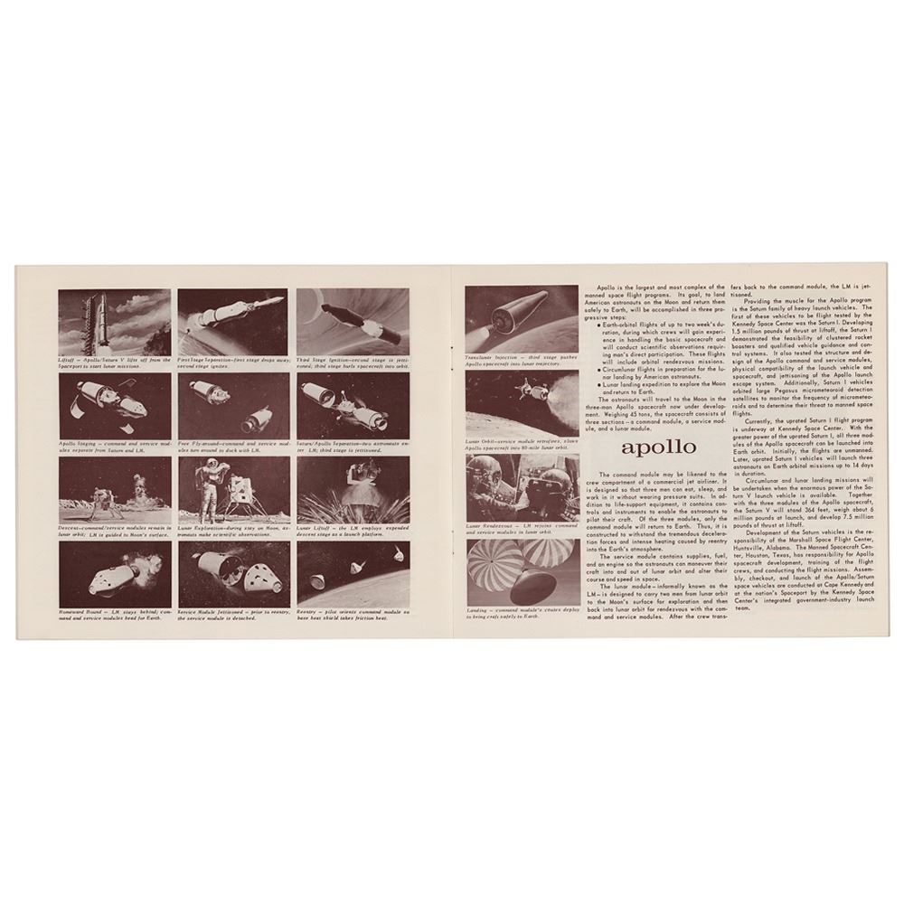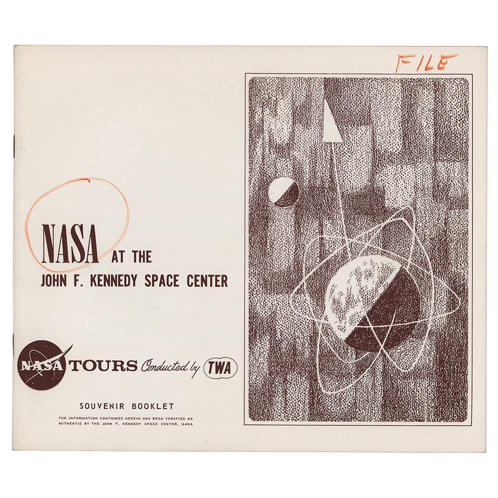 Souvenir booklet entitled "NASA at the John F. Kennedy Space Center," prepared for "NASA Tours Conducted by TWA," 24 pages, 9.25 x 8, providing brief outlines of NASA's launch vehicles, manned space flight programs (Mercury, Gemini, and Apollo), and a description of Launch Complex 39, and a few other related topics. In fine condition, with a "File" notation and red felt tip circle drawn on the front cover.