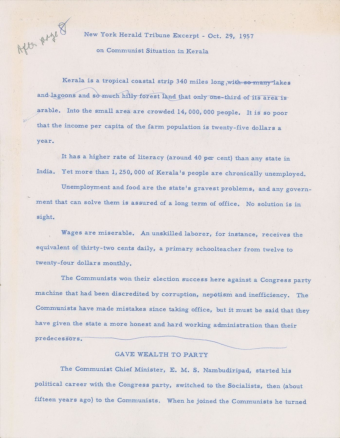 Typed draft for a speech by Senator John F. Kennedy, two pages, 8.5 x 11, titled and dated, "New York Herald Tribune Excerpt—Oct. 29, 1957 on Communist Situation in Kerala." A small number of notes and corrections have been made in an unknown hand. Drafted during Kennedy's tenure as a Democratic Senator, the speech focuses on the impoverished Communist situation in Kerala, in part: “It has a higher rate of literacy (around 40 per cent) than any state in India. Yet more than 1,250,000 of Kerala’s people are chronically unemployed. Unemployment and food are the state’s gravest problems, and any government that can solve them is assured of a long term of office. No solution is in sight. Wages are miserable. An unskilled laborer, for instance, receives the equivalent of thirty-two cents daily, a primary schoolteacher from twelve to twenty-four dollars monthly. The Communists won their election success here against a Congress party machine that had been discredited by corruption, nepotism and inefficiency. The Communists have made mistakes since taking office, but it must be said that they have given the state a more honest and hardworking administration than their predecessors.” In fine condition.