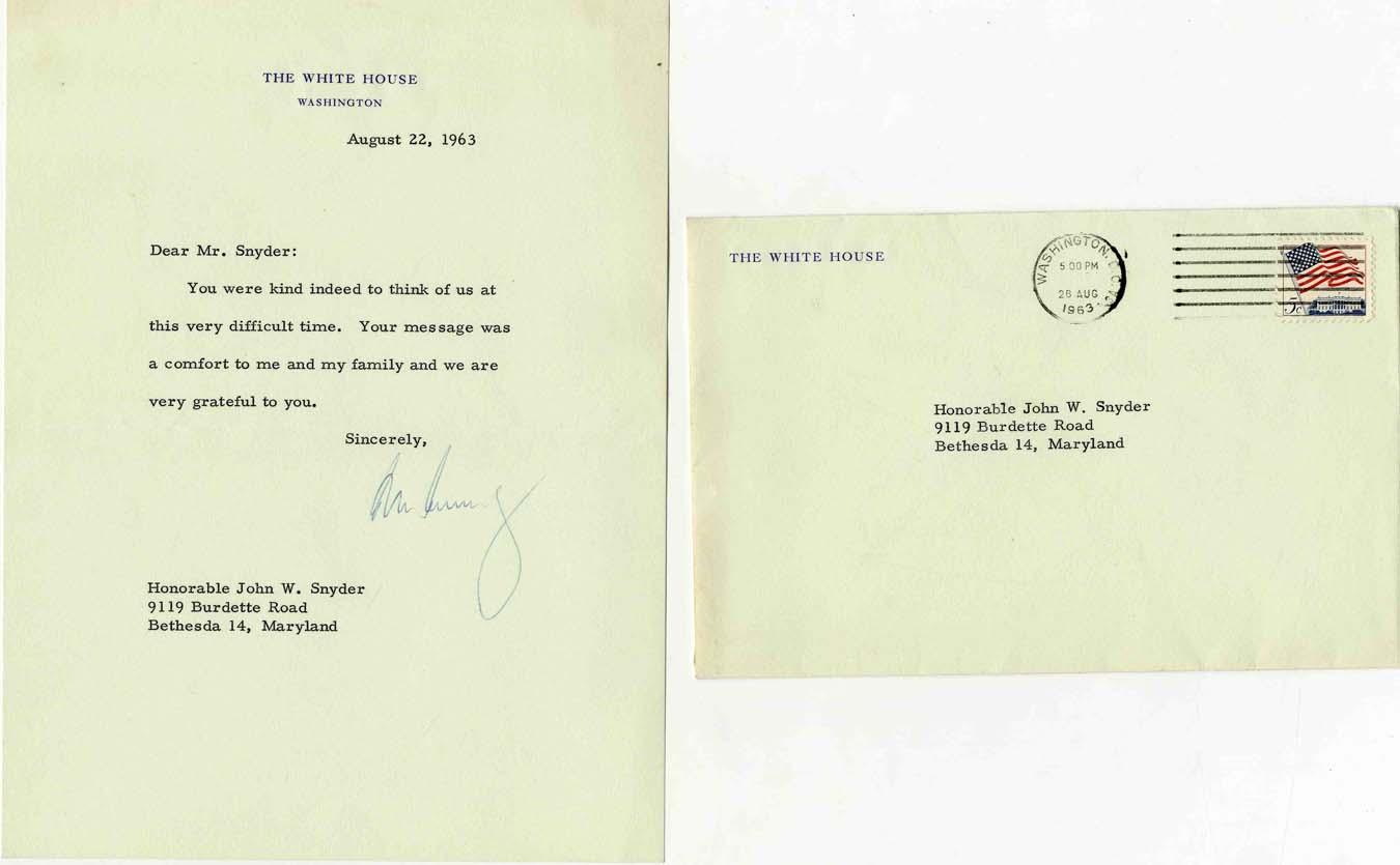 John F. Kennedy typed letter signed as President, dated 22 August 1963. Kennedy writes to former Treasury Secretary John W. Snyder, shortly after the death of his son Patrick Bouvier Kennedy. In full, ''You were kind to think of us at this very difficult time. Your message was a comfort to me and my family and we are very grateful to you. Sincerely, John Kennedy''. Letter upon White House stationery measures 6.75'' x 8.75''. Accompanied by White House mailing envelope. One mailing fold, else fine.