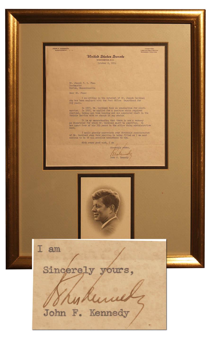 John F. Kennedy typed letter signed, dated 6 October 1954 on official ''United States Senate'' stationery. Letter on one page is addressed to Joseph Finn, Acting Postmaster in Boston, and recommends a former employee for a newly opened Dispatcher position. Reads in full: ''Dear Mr. Finn: I am writing in the interest of Mr. Joseph Cardinal who has been employed with the Post Office Department for 31 1/2 years. In 1937, Mr. Cardinal took an examination for clerk-carrier. In 1950, he applied for a position which required clerical, typing and time keeping and was appointed clerk in the Vehicle Service with no change in pay status. It is my understanding that there is now a vacancy as Dispatcher for which Mr. Cardinal might be qualified. He has spent four of his 31 1/2 years in the office doing administrative work. I would greatly appreciate your favorable consideration of Mr. Cardinal when this position is being filled as I am most anxious to be of all possible assistance to him. With every good wish, I am Sincerely yours, John F. Kennedy''. Signed ''John Kennedy'' in black ink above his typed name. With two expected folds from mailing and a staple mark at top left. Letter, measuring 8'' x 8'' is nicely framed to an overall size of 13.5'' x 17.25''. Near fine.