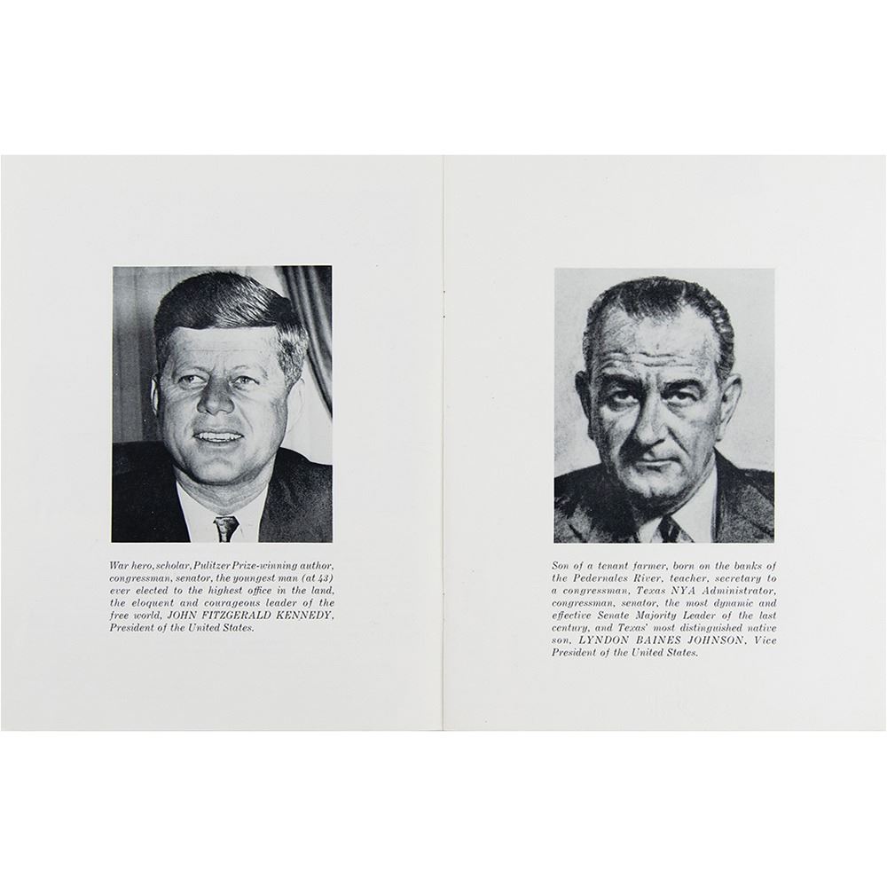 Three scarce 'Texas Welcome' items: an original one-page broadside program for the 'Texas Welcome Dinner' which was to be held at the Municipal Auditorium in Austin, Texas, on November 22, 1963, 8.5 x 14, listing the speakers for the event and featuring images and facsimile signatures of honored guests John F. Kennedy, Lyndon B. Johnson, and John B. Connally; a souvenir program booklet for the 'Texas Welcome' dinner to be held at the Municipal Auditorium in Austin, Texas, on November 22, 1963, 8.5 x 11, 16 pages, containing brief biographies of the guests plus local advertisements; and a 7 x 9.75 invitation for the dinner, scheduled for November 22, 1963, at 7:30 PM. In overall fine condition.