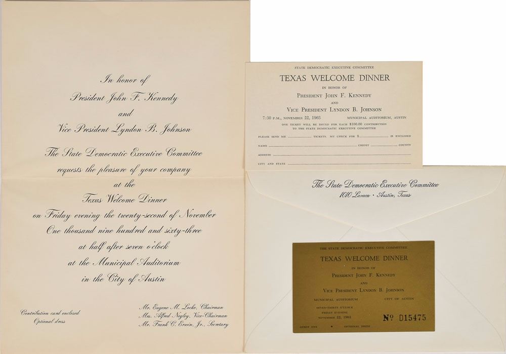 Four items: an original invitation for the Texas Welcome Dinner to be held in honor of President John F. Kennedy and Vice President Lyndon B. Johnson at Austin's Municipal Auditorium on the evening of November 22, 1963, one page, 7 x 9.75; an original gold-colored 4 x 2.5 ticket to the event, no. D15475; a blank 5 x 3 RSVP response card; and a blank State Democratic Executive Committee mailing envelope. In overall fine condition. Organized by the State Democratic Executive Committee, more than 5,000 Austinites planned to attend this fundraising dinner on the final stop of the president's tour of Texas. Scheduled to occur on the night of Kennedy's assassination, the dinner would never take place.