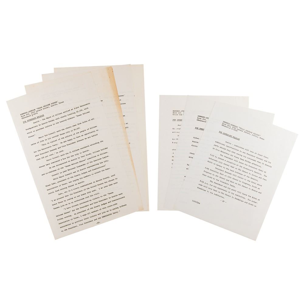 Group of press releases pertaining to the the “Texas Welcome Dinner†to be hosted for President John F. Kennedy at the Municipal Auditorium in Austin, Texas, on the night of the assassination, November 22, 1963, totaling seven pages, measuring from 8.5 x 11 to 8.5 x 14. The press releases supply the media with news pertaining to Kennedy's visit and promotes the sale of tickets to the dinner; one serves as a who's-who of the guest list, and the president's motorcade lineup is furnished as well. In fine condition.