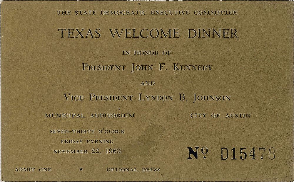 Scarce original gold-colored ticket, number D15478, 4 x 2.5, to the 'Texas Welcome Dinner' presented in honor of President John F. Kennedy and Vice President Lyndon B. Johnson, to be held at the Municipal Auditorium in Austin at 7:30 on November 22, 1963. In very good to fine condition, with light surface scuffing and adhesive remnants to reverse. Organized by the State Democratic Executive Committee, more than 5,000 Austinites planned to attend this fundraising dinner on the final stop of the president's tour of Texas. Scheduled to occur on the night of Kennedy's assassination, the dinner would never take place.