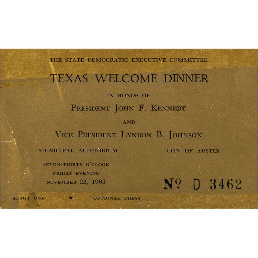 Scarce original gold-colored ticket to the 'Texas Welcome Dinner' presented in honor of President John F. Kennedy and Vice President Lyndon B. Johnson, number D3462, 4 x 2.5, to be held at the Municipal Auditorium in Austin at 7:30 on November 22, 1963. In very good to fine condition, with small stains and creases, and a light paperclip impression to the top edge. Organized by the State Democratic Executive Committee, more than 5,000 Austinites planned to attend this fundraising dinner on the final stop of the president's tour of Texas. Scheduled to occur on the night of Kennedy's assassination, the dinner would never take place.