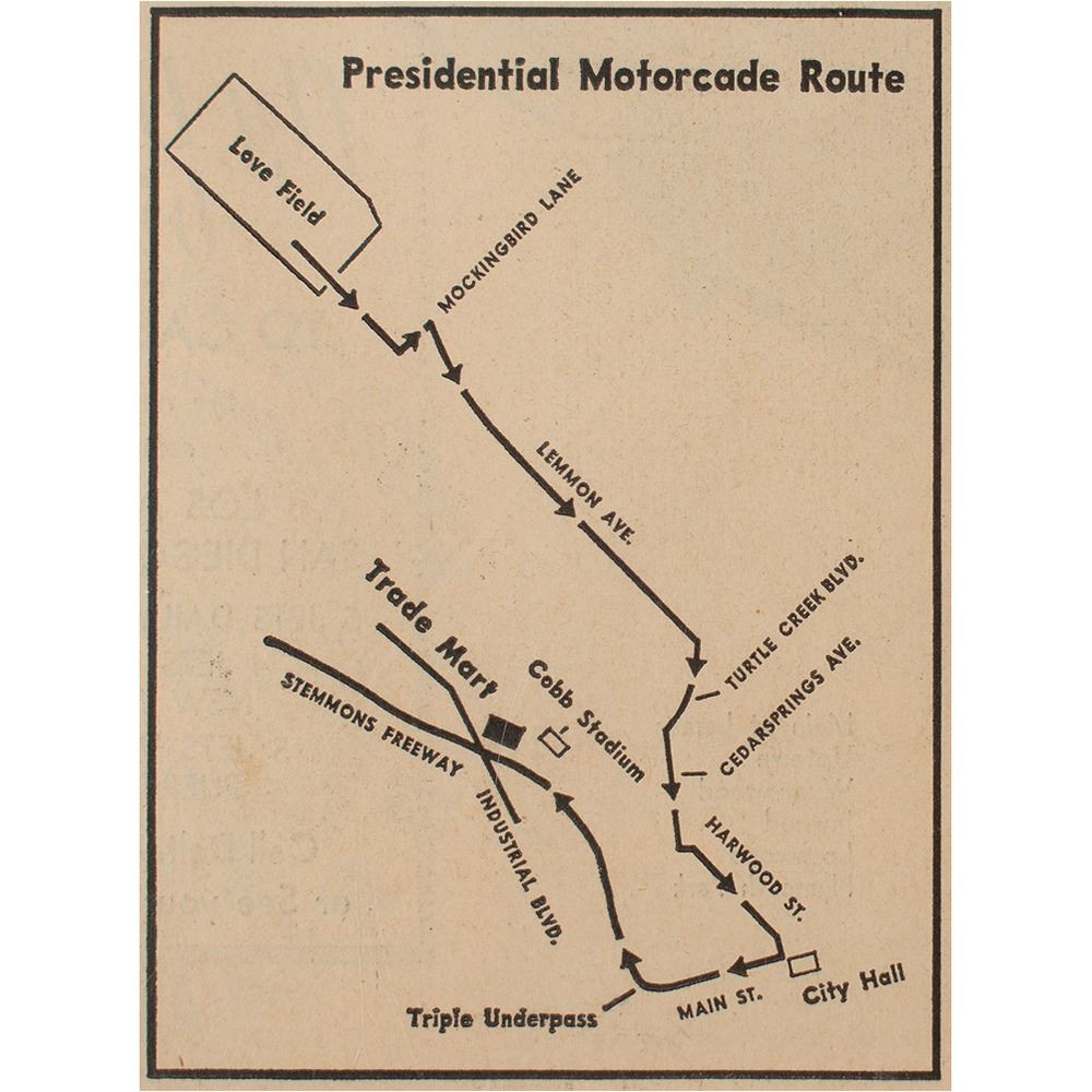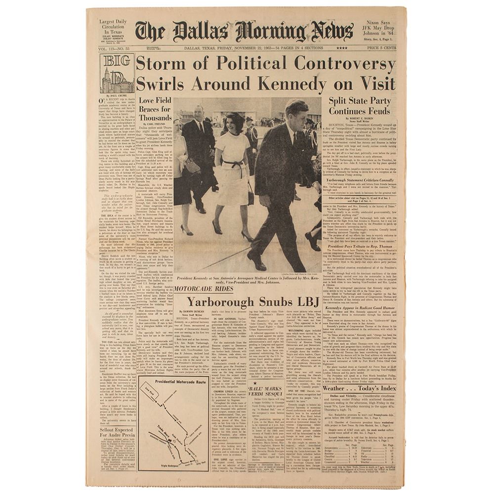 Complete issue of the Dallas Morning News from November 22, 1963, 54 pages, 15.5 x 23, with a headline reading, "Storm of Political Controversy Swirls Around Kennedy on Visit." An image of JFK, Jackie, Lyndon B. Johnson, and Lady Bird appears below. The lower portion of the front page features a description and map of the president's motorcade, where tragedy would strike later that day. In fine condition.