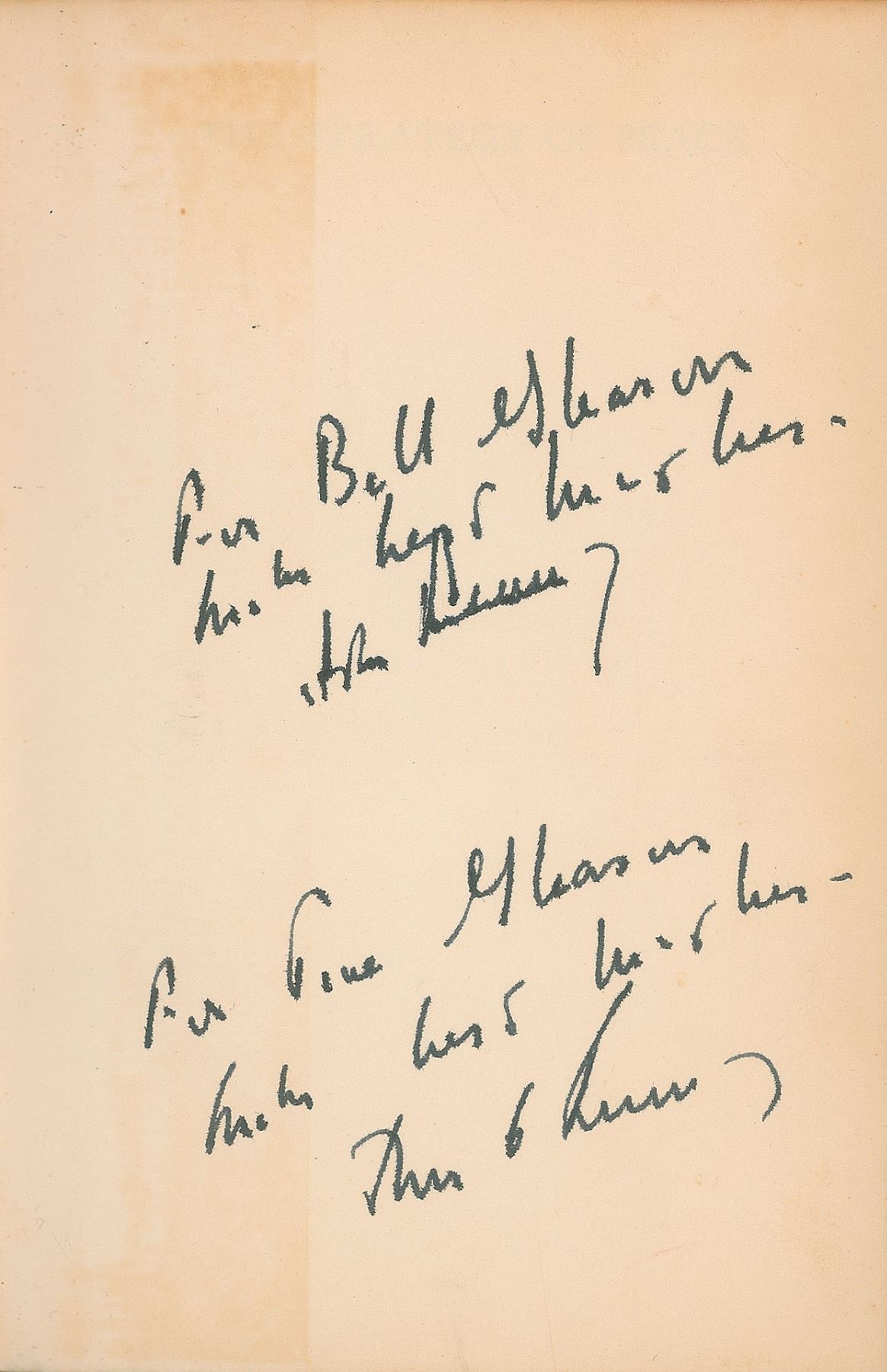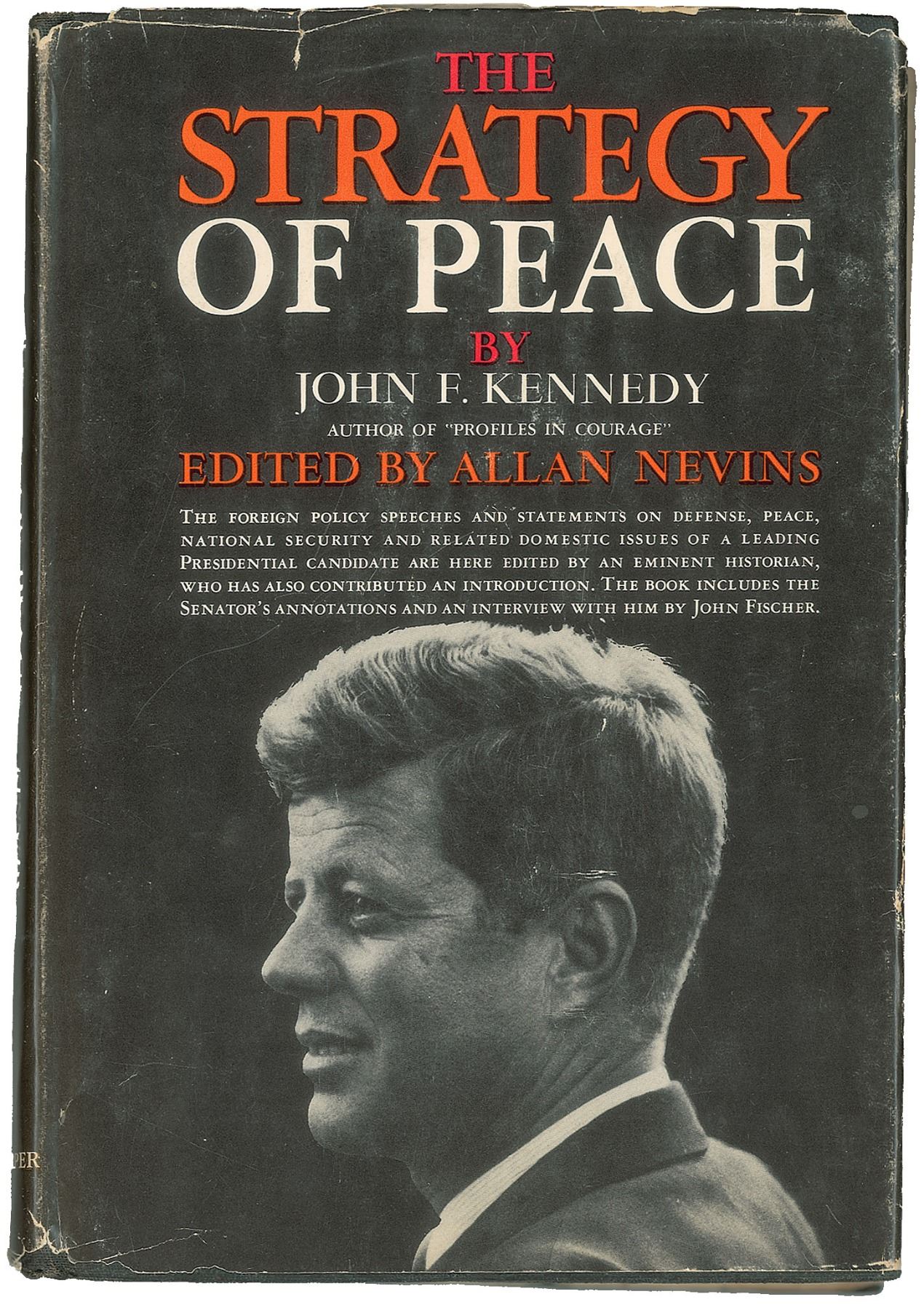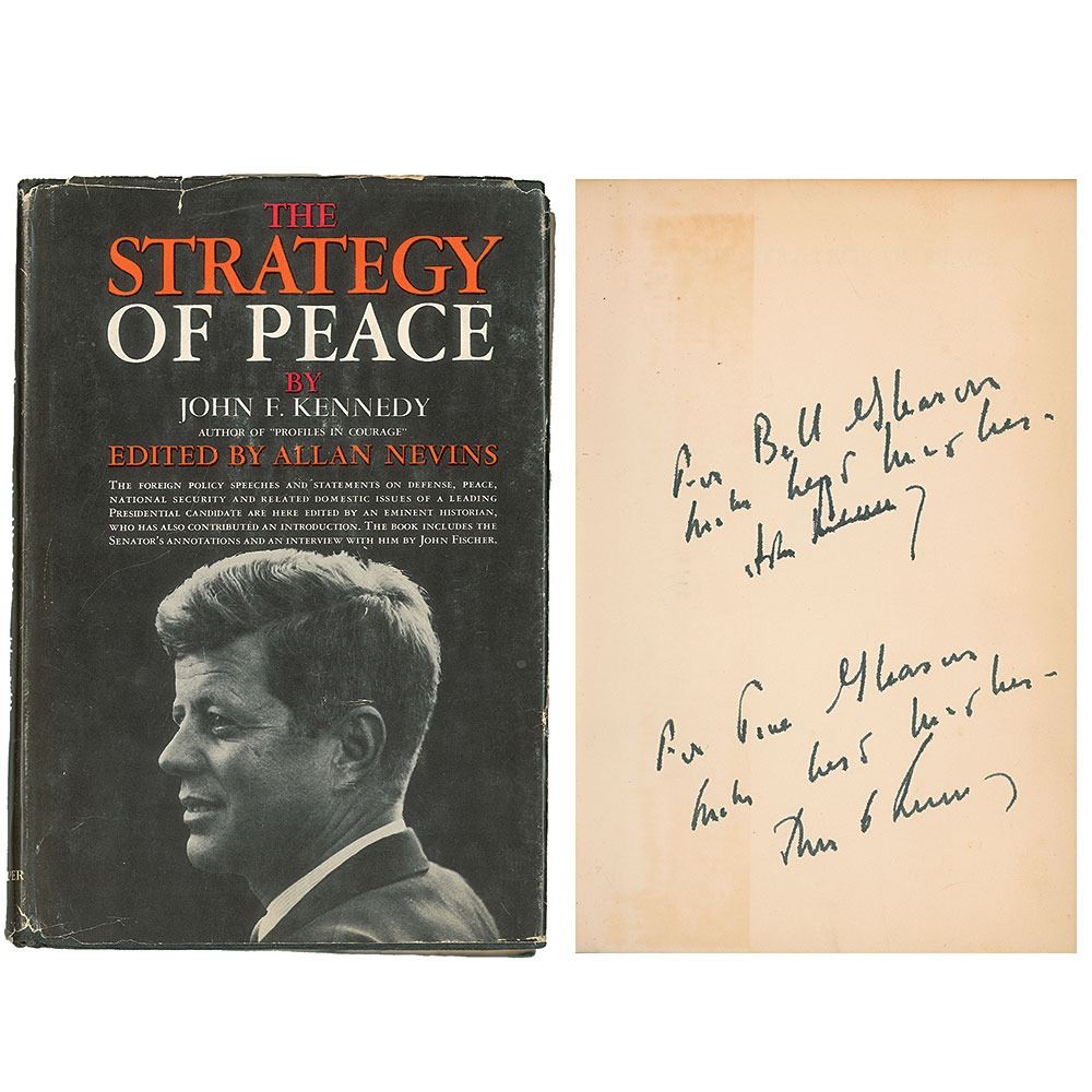 Twice-signed book: The Strategy of Peace. Later printing. NY: Harper & Brothers, 1960. Hardcover with dust jacket, 6 x 8.5, 233 pages. Signed and inscribed twice on the first free end page in bold ink, "For Bill Gleason, with best wishes, John Kennedy" and "For Tim Gleason, with best wishes—John F. Kennedy." Autographic condition: fine, with light pastedown-related toning to the left side of the signed page, and very slight feathering to the ink. Book condition: VG/VG, with some staining to pastedowns, and small nicks and tears to dust jacket.