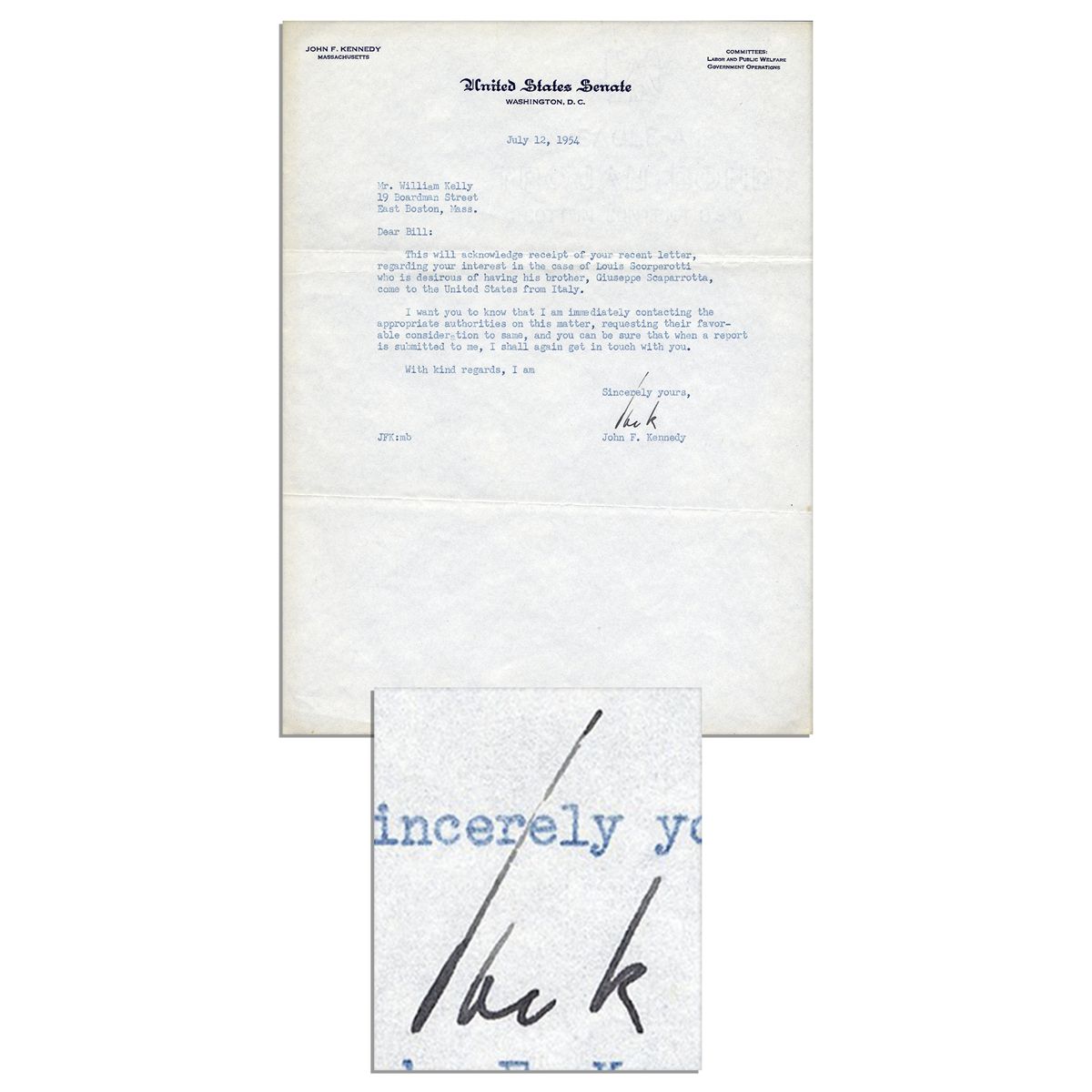 John F. Kennedy typed letter signed ''Jack'' as a Senator from Massachusetts. Letter dated 12 July 1954 on Senate stationery is addressed to William Kelly of East Boston, Massachusetts and reads in full, ''This will acknowledge receipt of your recent letter, regarding your interest in the case of Louis Scorperotti who is desirous of having his brother, Giuseppe Scaparrotta come to the United States from Italy. I am immediately contacting the appropriate authorities on this matter, requesting their favorable consideration to same, and you can be sure that when a report is submitted to me, I shall again get in touch with you.'' Single-page letter measures 8'' x 10.5''. Faint creasing, else near fine.
