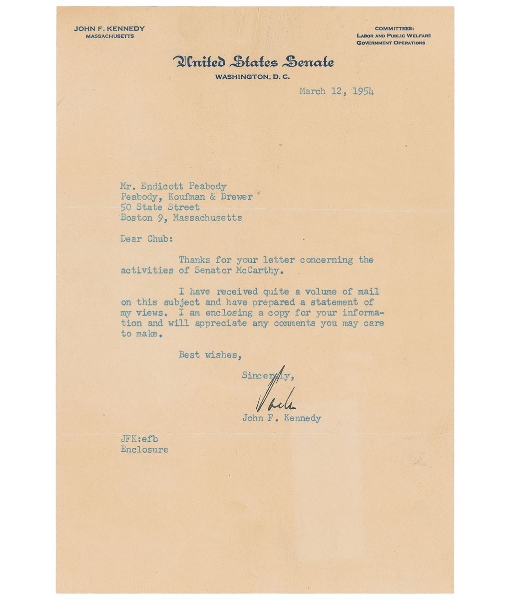 TLS signed “Jack,” one page, 6.25 x 9.25, United States Senate letterhead, March 12, 1954. Letter to Massachusetts lawyer Endicott Peabody, who would go on to become the state’s governor. In full: “Thanks for your letter concerning the activities of Senator McCarthy. I have received quite a volume of mail on this subject and have prepared a statement of my views. I am enclosing a copy for your information and will appreciate any comments you may care to make.” Included is the enclosure referenced, entitled “Statement on the Conduct of Congressional Committees and Members of Congress,” in which Kennedy addresses the subject but goes to great lengths to avoid singling out McCarthy.