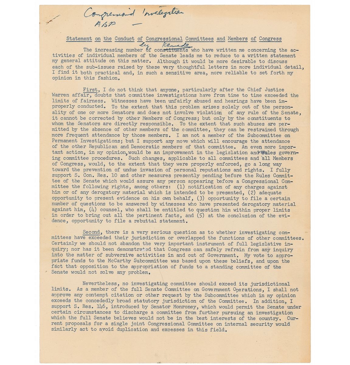 My vote to appropriate funds to the McCarthy Subcommittee was based upon these beliefs…Third…The personal conduct of an individual Senator does not represent the United States Senate as a whole; nor is every other Senator responsible for such conduct…I am sure that you will agree that in the long run this is essential to our democratic way of life. If a majority were permitted to still the voice of a minority or of a single Member…or to expel him from the Senate because his views and methods may be repugnant to them; this would, I believe, set a precedent that would return to haunt those of us who believe with Thomas Jefferson that '…error of opinion may be tolerated where reason is left free to combat it.’” In fine condition, with slightly irregular light toning and a couple of paperclip impressions to top edge.
