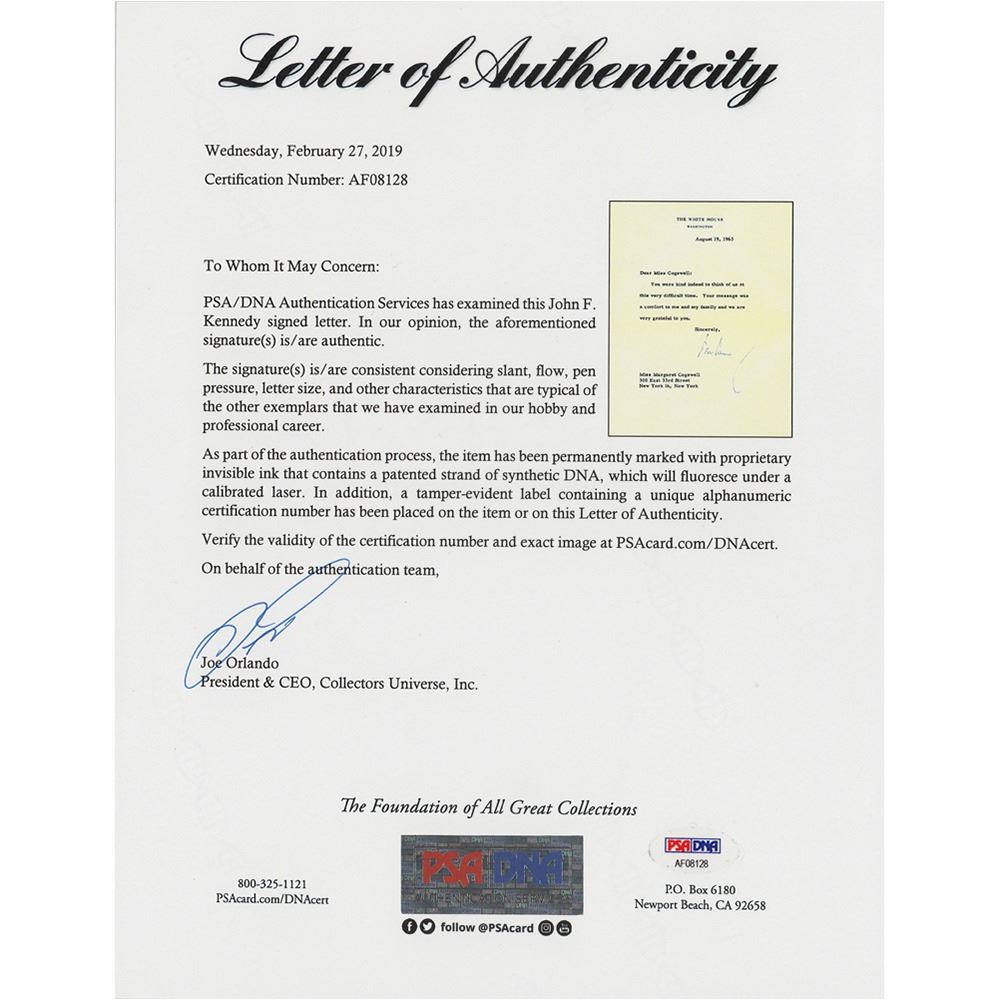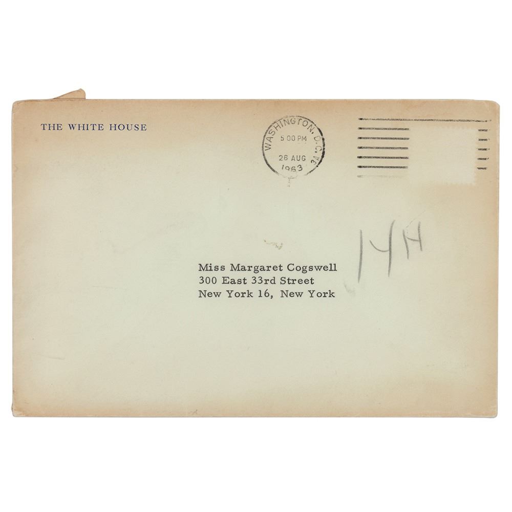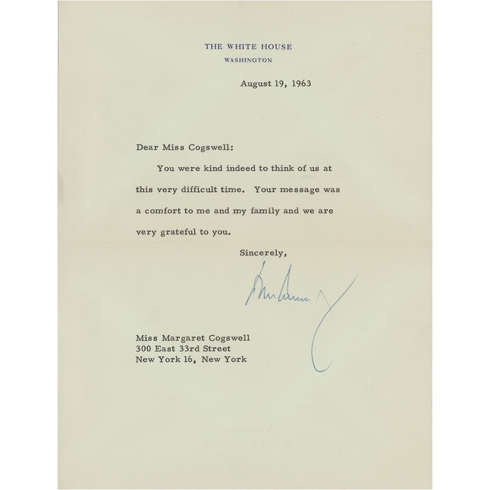 TLS as president signed “John Kennedy,†one page, 6.75 x 8.75, White House letterhead, August 19, 1963. Letter to Margaret Cogswell, gratefully sending thanks for her support after the death of his premature son. In full: "You were kind indeed to think of us at this very difficult time. Your message was a comfort to me and my family and we are very grateful to you." In fine condition. Accompanied by the original mailing envelope and a full letter of authenticity from PSA/DNA.