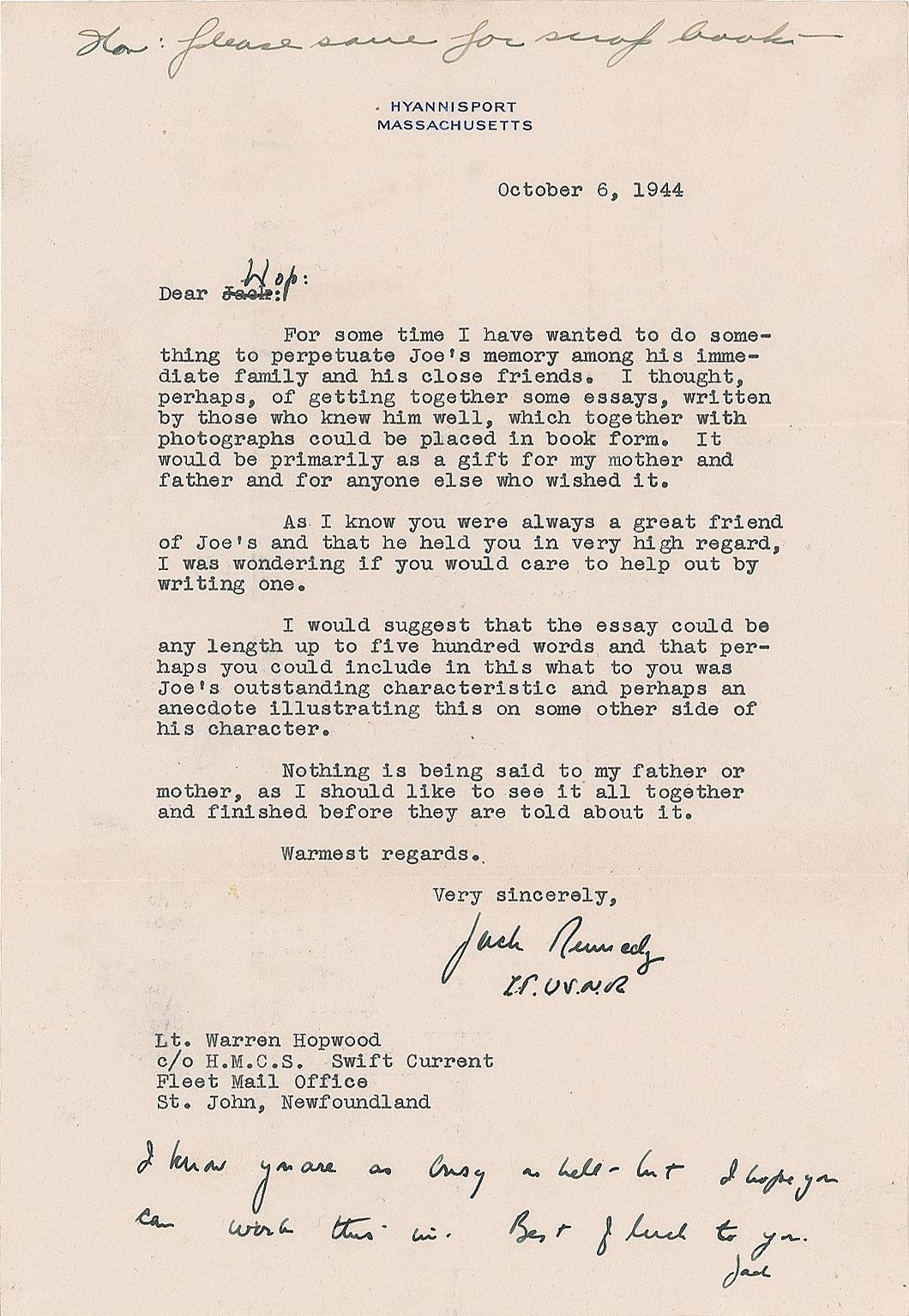 TLS signed “Jack Kennedy, Lt. U.S.N.R.,” one page, 7.25 x 10.5, Hyannisport letterhead, October 6, 1944. Letter to Warren 'Hop' Hopwood, about the project that would result in As We Remember Joe, a memorial volume privately printed in 1945 in honor of his brother, Joseph P. Kennedy, Jr., who had been killed when his plane exploded over England a month earlier. In full: "For some time I have wanted to do something to perpetuate Joe's memory among his immediate family and his close friends. I thought, perhaps, of getting together some essays, written by those who knew him well, which together with photographs could be placed in book form. It would be primarily as a gift for my mother and father and for anyone else who wished it. As I know you were always a great friend of Joe's and that he held you in very high regard, I was wondering if you would care to help out by writing one. I would suggest that the essay could be any length up to five hundred words and that perhaps you could include in this what to you was Joe's outstanding characteristic and perhaps an anecdote illustrating this on some other side of his character. Nothing is being said to my father or mother, as I should like to see it all together and finished before they are told about it." He adds an autograph postscript, in full: "I know you are as busy as hell—but I hope you can work this in. Best of luck to you. Jack." In fine condition.