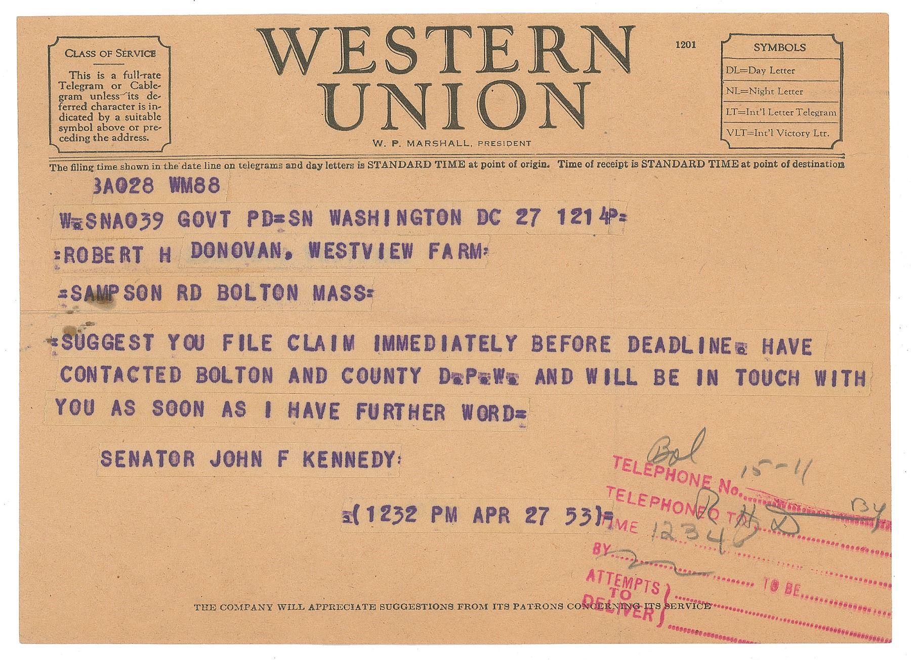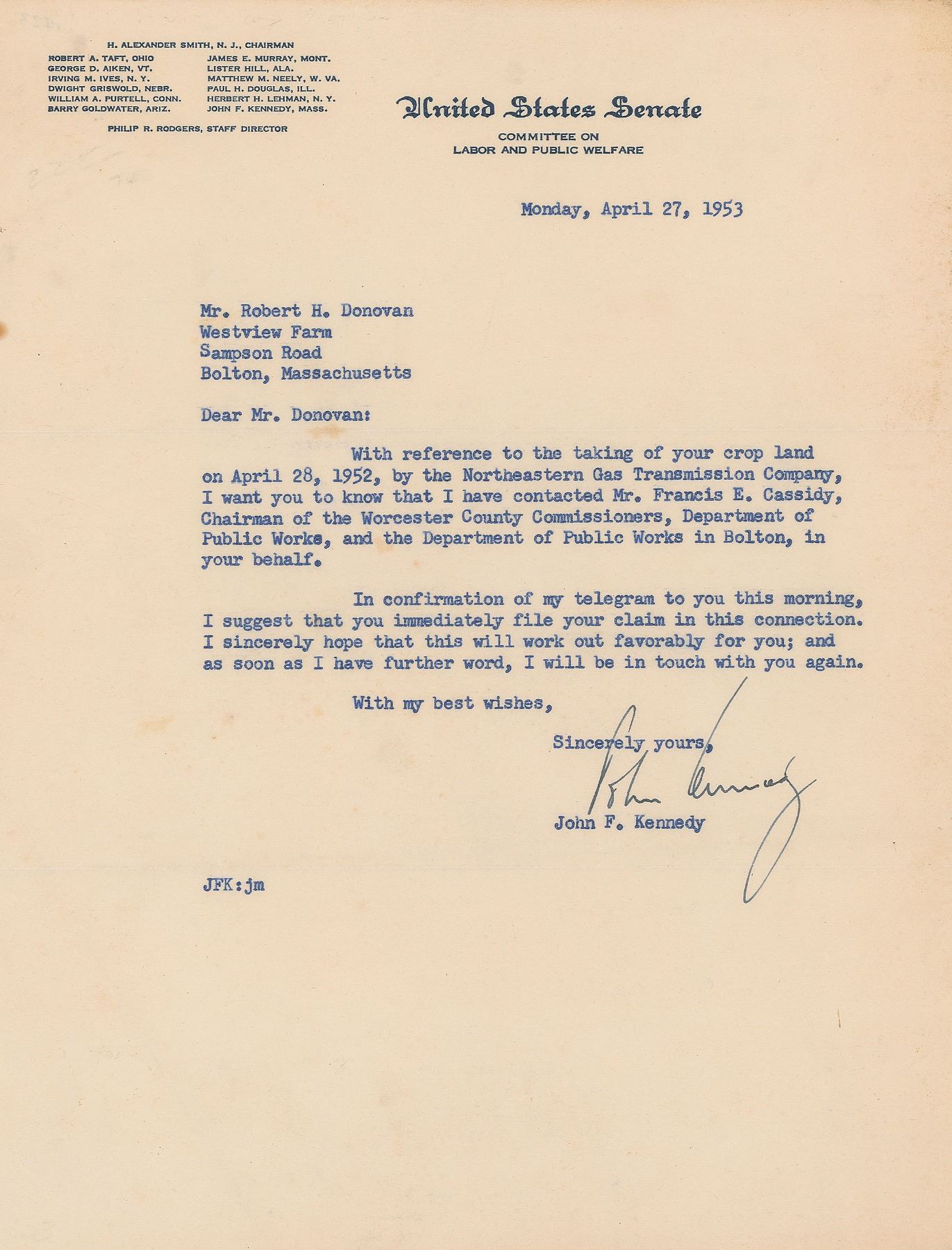TLS signed “John Kennedy,” one page, 8 x 10.5, United States Senate letterhead, April 27, 1953. Letter to Robert H. Donovan, evidently concerning an eminent domain dispute. In full: "With reference to the talking of your crop land on April 28, 1952, by the Northeastern Gas transmission Company, I want you to know that I have contacted Mr. Francis E. Cassidy, Chairman of the Worcester County Commissioners, Department of Public Works, and the Department of Public Works in Bolton, in your behalf. In confirmation of my telegram to you this morning, I suggest that you immediately file your claim in this connection. I sincerely hope that this will work out favorably for you; and as soon as I have further word, I will be in touch with you again." In fine condition, with a few light diagonal creases. Accompanied by the referenced telegram, advising Donovan to file a claim immediately.