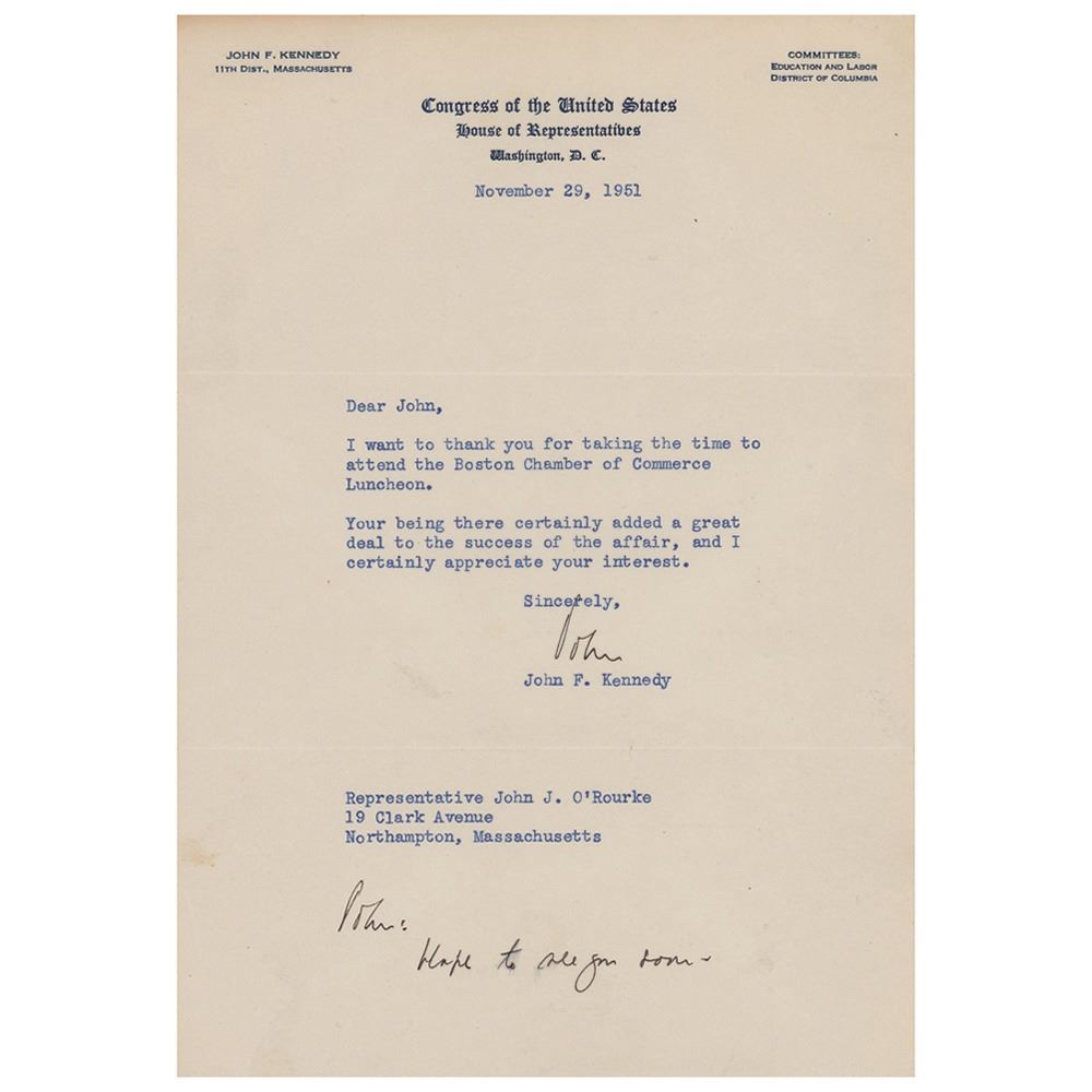 TLS signed “John,†one page, 6.25 x 9, personal Congress of the United States letterhead, November 29, 1951. Letter to fellow Massachusetts Representative John O'Rourke, in full: "I want to thank you for taking the time to attend the Boston Chamber of Commerce Luncheon. Your being there certainly added a great deal to the success of the affair, and I certainly appreciate the interest." Kennedy adds a handwritten postscript: "John: Hope to see you soon." In fine condition, with a slight brush to the postscript.