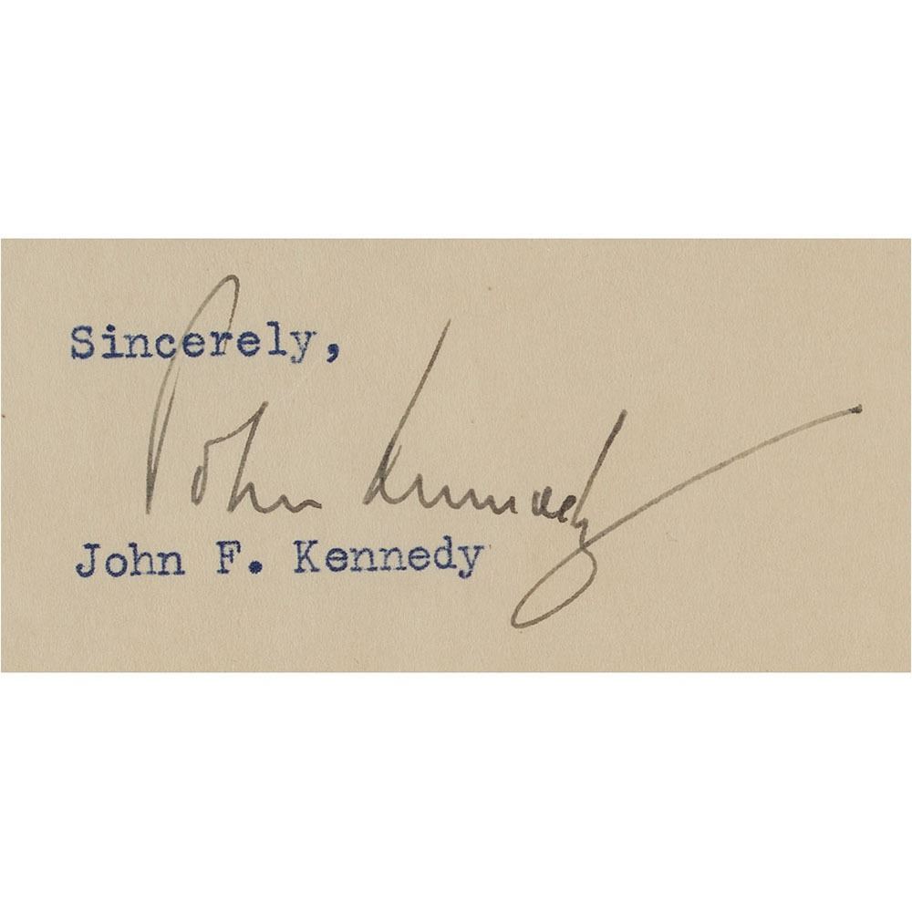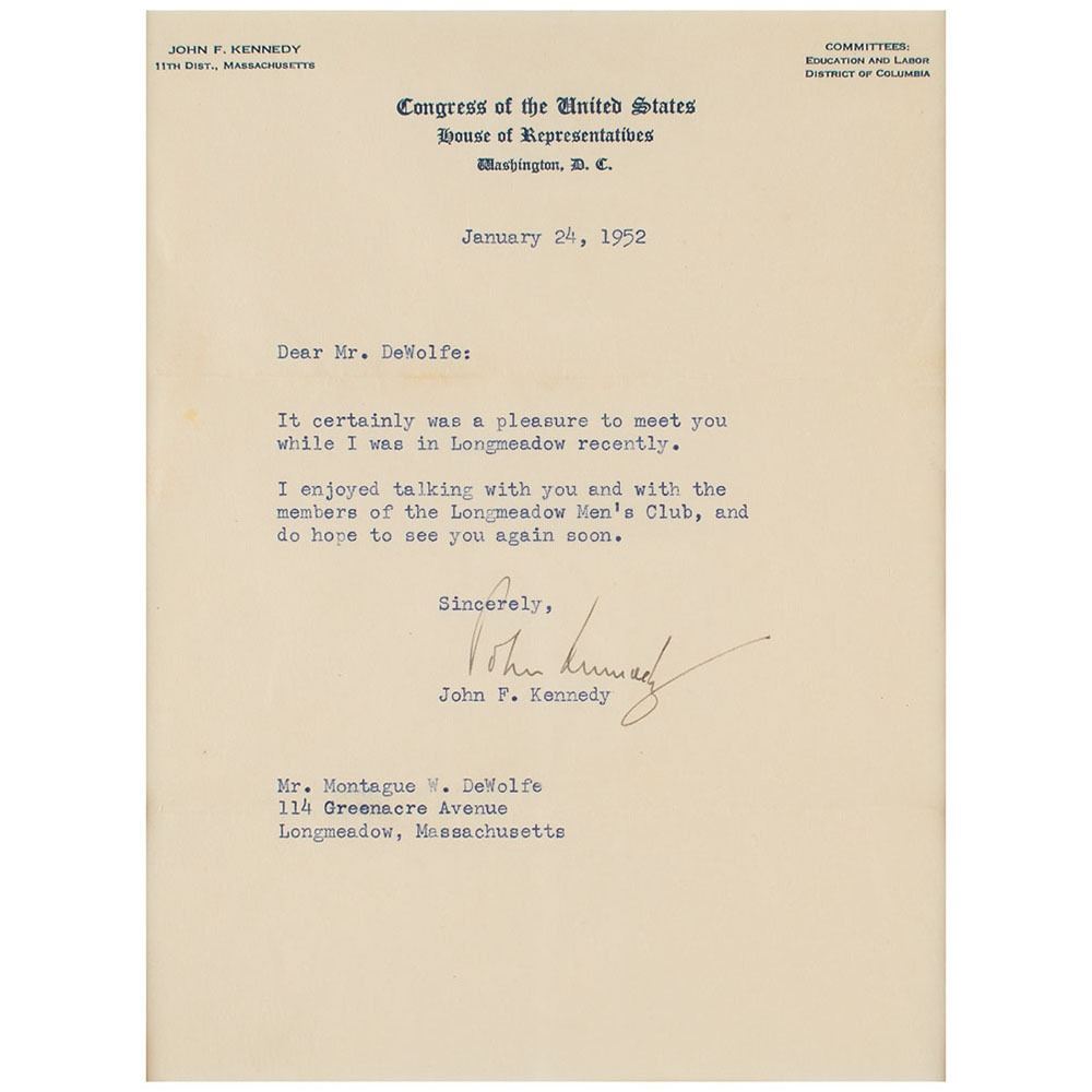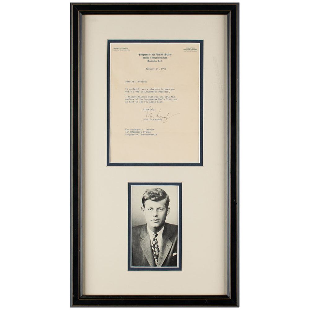 TLS signed “John Kennedy,†one page, 5.75 x 7.75, House of Representatives letterhead, January 24, 1952. Letter sent while campaigning for his seat in the US Senate, to a future constituent in Longmeadow, Massachusetts. In full: "It certainly was a pleasure to meet you while I was in Longmeadow recently. I enjoyed talking with you and with the members of the Longmeadow Men's Club, and do hope to see you again soon." Handsomely double-matted and framed with a portrait to an overall size of 11 x 20. In very good to fine condition, with light creasing along the two mailing folds. Accompanied by the original mailing envelope, bearing a pre-printed free frank.
