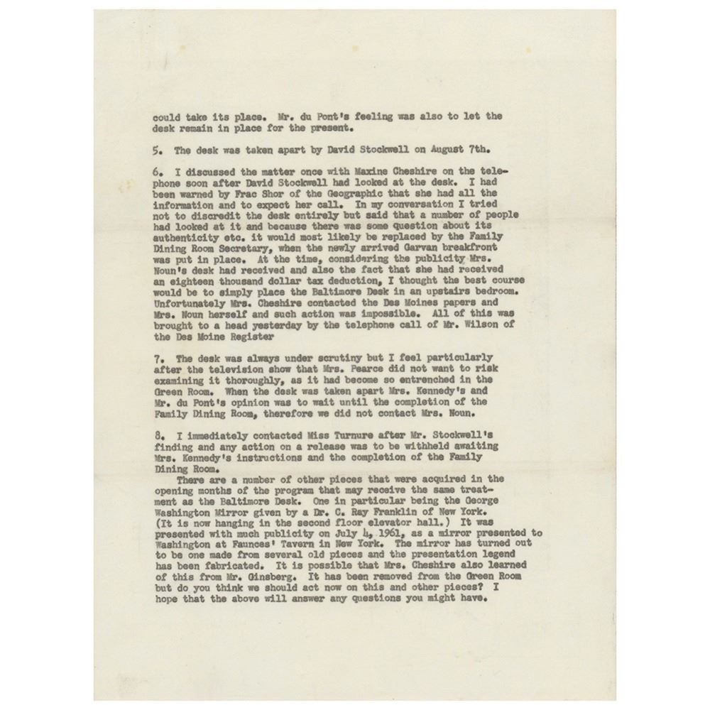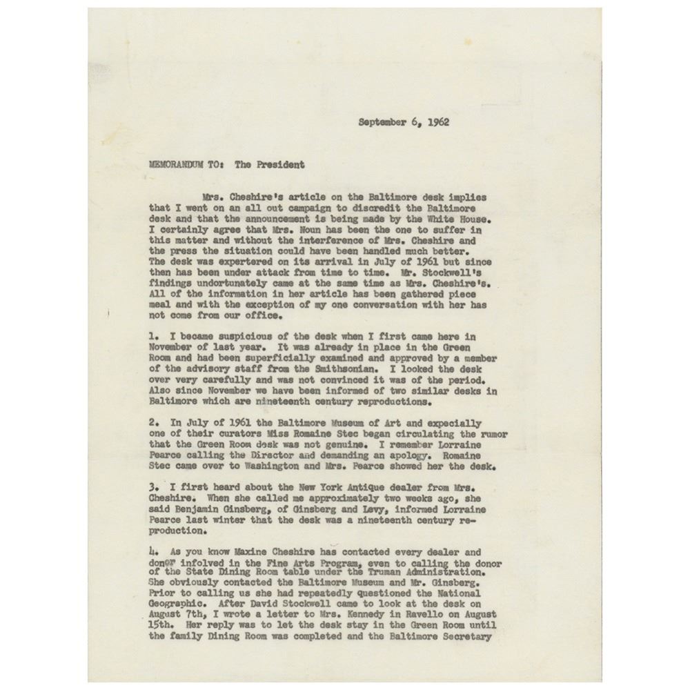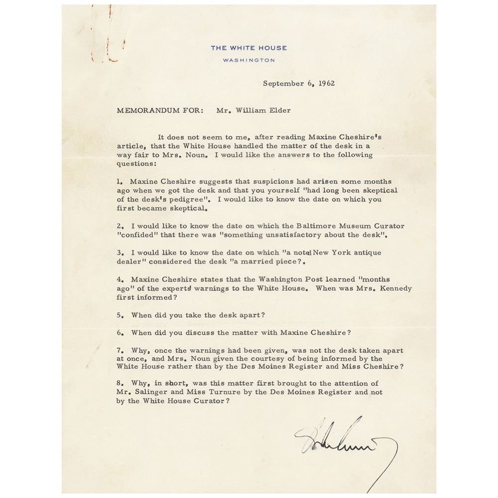 Typed memo signed as president, "John Kennedy," one page, 8 x 10.5, White House letterhead, September 6, 1962. Memo to White House curator William Elder, in which the president tersely demands answers to eight pointed questions regarding the discovery that a 'Baltimore desk' donated by Mrs. Maurice Noun of Iowa was not genuine, a revelation that took the White House-and Mrs. Noun-by surprise. In part: "It does not seem to me, after reading Maxine Cheshire's article, that the White House handled the matter of the desk in a way fair to Mrs. Noun. I would like the answers to the following questions…Cheshire suggests that suspicions had arisen some months ago when we got the desk and that you yourself 'had long been skeptical of the desk's pedigree.' I would like to know the date on which you first became skeptical…I would like to know the date on which the Baltimore Museum Curator 'confided' that there was 'something unsatisfactory about the desk'…the Washington Post learned 'months ago' of the experts' warnings to the White House. When was Mrs. Kennedy first informed?…Why, in short, was this matter first brought to the attention of Mr. Salinger and Miss Turnure by the Des Moines Register and not by the White House Curator?" Elder's retained carbon copy of his two-page response is included. In fine condition, with some light creasing and rusty paperclip impressions to the upper left corner, and a trivial blot to the signature.