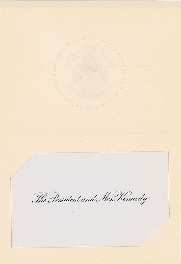 Official off-white 4 x 2.25 White House presentation card for VIPs, imprinted in black, "The President and Mrs. Kennedy," inside a 4.5 x 3.25 card gilt-embossed with a presidential seal. Includes the original envelope. In very fine condition.