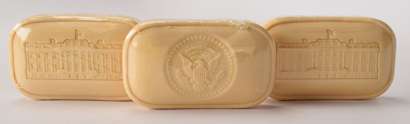 Boxed set of soap given to VIP guests at the White House during the Kennedy administration, measuring 7.5 x 4 x 1.25, containing three large bars of white soap (still sealed in their original wrappers), impressed with images of the White House on one side and the presidential seal on the other. The handsome white box is lined with gold foil and embossed on the cover with golden images of the White House and presidential seal, with "Presidential" inscribed in between. In fine condition.