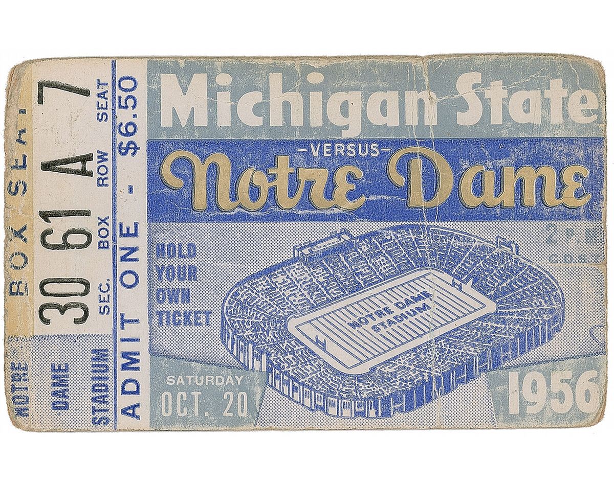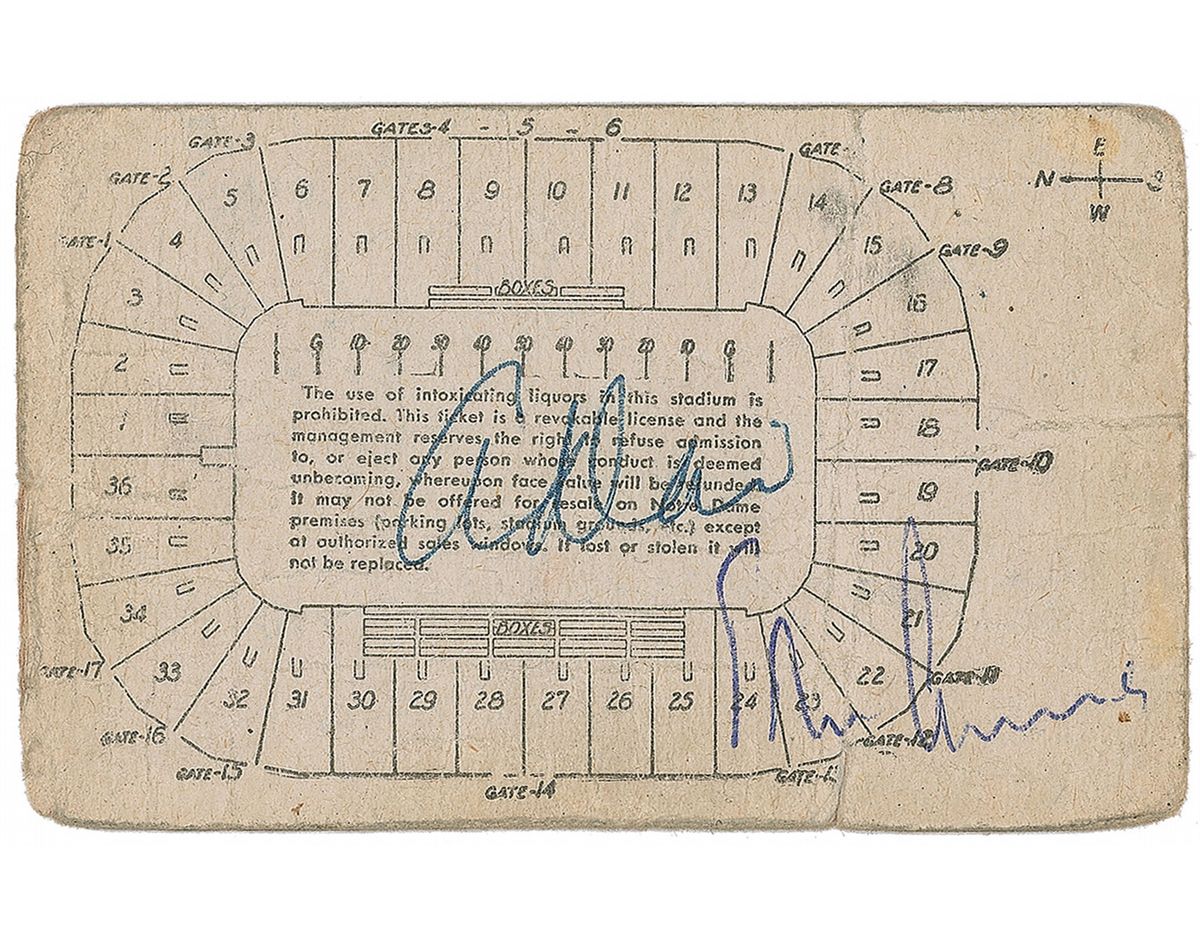 Original ticket for the October 20, 1956, Notre Dame–Michigan State football game, held at Notre Dame Stadium in South Bend. Signed on the reverse over the stadium seating chart in blue ballpoint by John F. Kennedy and Adlai Stevenson signing his first name only. Expected handling wear, a vertical crease through a single letter of Kennedy’s signature, and light rubbing and fading to ticket face, otherwise fine condition. The number two ranked Spartans would trounce the Irish 47–14. A neat association between Kennedy and football.
