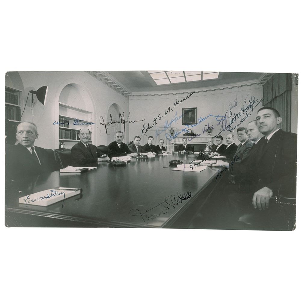 Extremely rare first photograph of President Kennedy with his cabinet taken Jan. 27, 1961 with signatures of the President and all 12 cabinet members: Signatures include John F. Kennedy, Robert F. Kennedy, Lyndon B. Johnson, Adlai Stevenson, Robert S. McNamara, Dean Rusk, Arthur J. Goldberg, J. Edward Day, Orville Freeman, Abraham A. Ribicoff, Luther H. Hodges, C. Douglas Dillon, and Stewart L. Udall. Historically significant signed artifact of President Kennedy and his cabinet.