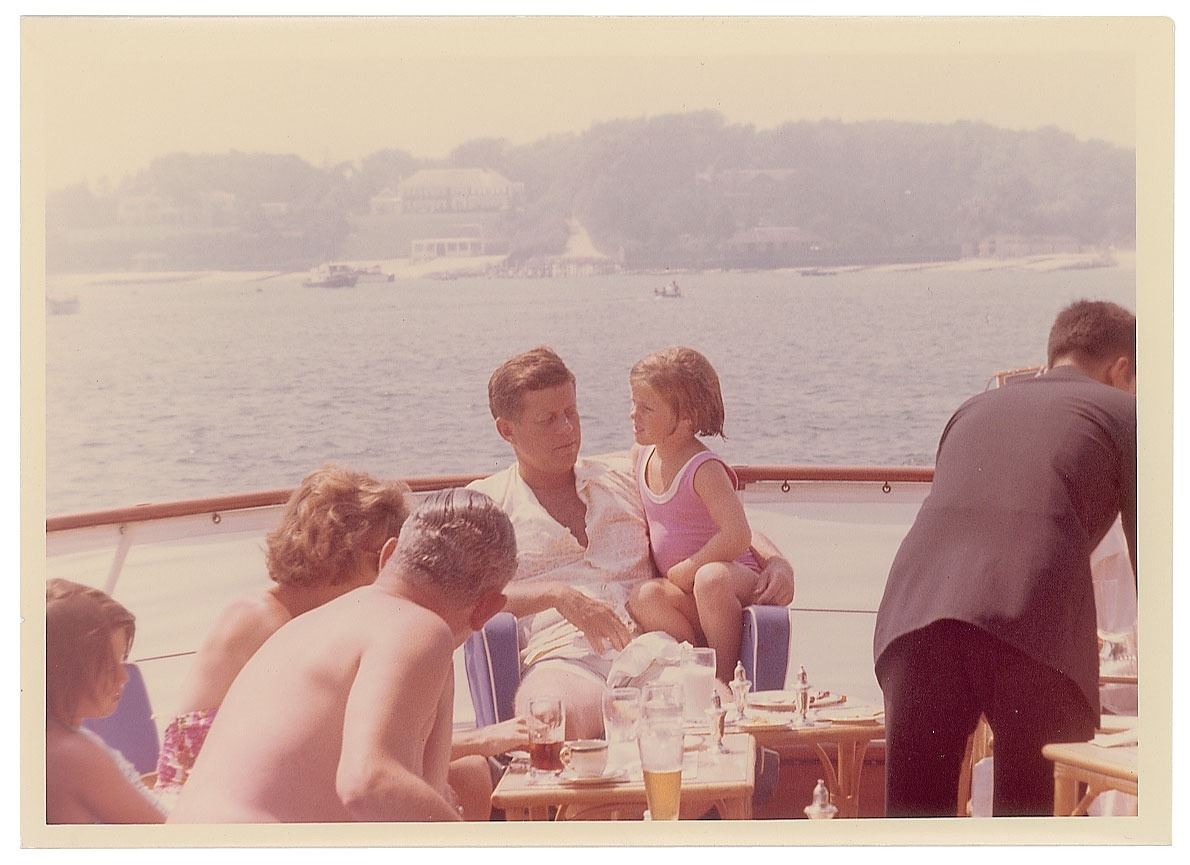 Cecil Stoughton's own original vintage color glossy 7 x 5 photo of Caroline Kennedy sitting with her father John F. Kennedy aboard the Honey Fitz at Hyannisport, taken by official White House photographer Cecil W. Stoughton in 1963. Reverse bears "A Kodak Paper" watermarks and pencil notations, "C250-39-63." In very fine condition. From the collection of Cecil W. Stoughton.