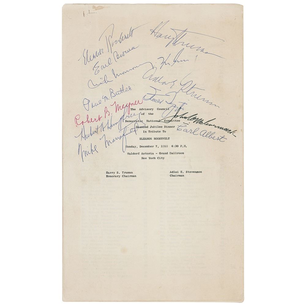 Seating list from the Advisory Council of the Democratic National Committee Diamond Jubilee Dinner honoring Eleanor Roosevelt at the Waldorf-Astoria in New York City on December 7, 1959, eight pages 8.5 x 14, signed on the cover sheet in blue ballpoint by John F. Kennedy, Harry S. Truman, and Eleanor Roosevelt. The cover is also signed by 10 other Democratic leaders in ink and ballpoint, including: Adlai Stevenson, Hubert H. Humphrey, Pat Brown, Paul M. Butler, Mike Monroney, Mike Mansfield, Carl Albert, John McCormack, Stuart Symington, and Robert Meyner. In very good to fine condition, with staple holes and a paperclip impression to the upper left corner, light toning, and two horizontal folds.