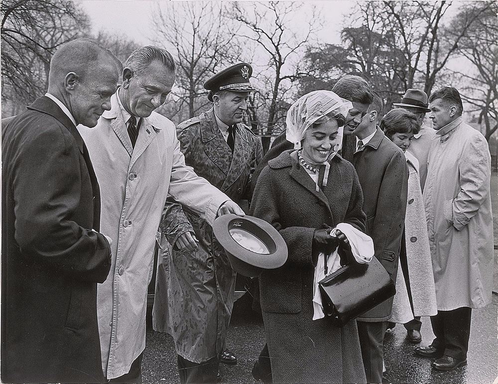 Original vintage circa 1962 glossy 13.5 x 10.25 silver gelatin photo of President John F. Kennedy, Vice President Lyndon B. Johnson, and John Glenn outdoors in the rain, taken by Ollie Atkins of the Saturday Evening Post. Reverse bears Ollie Atkins/Saturday Evening Post credit stamps. In fine condition, with some creasing to the top and bottom. Kennedy famously helped launch the 'space race' when he called for America to put a man on the moon by the end of the decade, and Glenn made enormous strides toward that goal when he became the first American to orbit Earth in February 1962. A fabulous image capturing three great Americans at a singular moment in time.