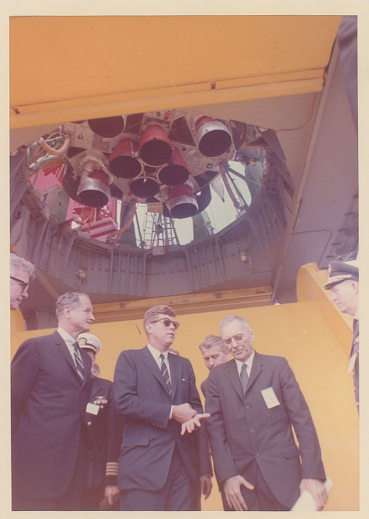 Official White House photographer Cecil W. Stoughton's own original vintage color glossy 5 x 7 photo of John F. Kennedy beneath a huge Saturn rocket engine at Cape Canaveral's Launch Complex 37, Pad B, with Wernher von Braun in the background, taken by Stoughton on November 16, 1963. Reverse bears "A Kodak Paper" watermarks and a pencil annotation, "C400-7." In very fine condition. From the collection of Cecil W. Stoughton.