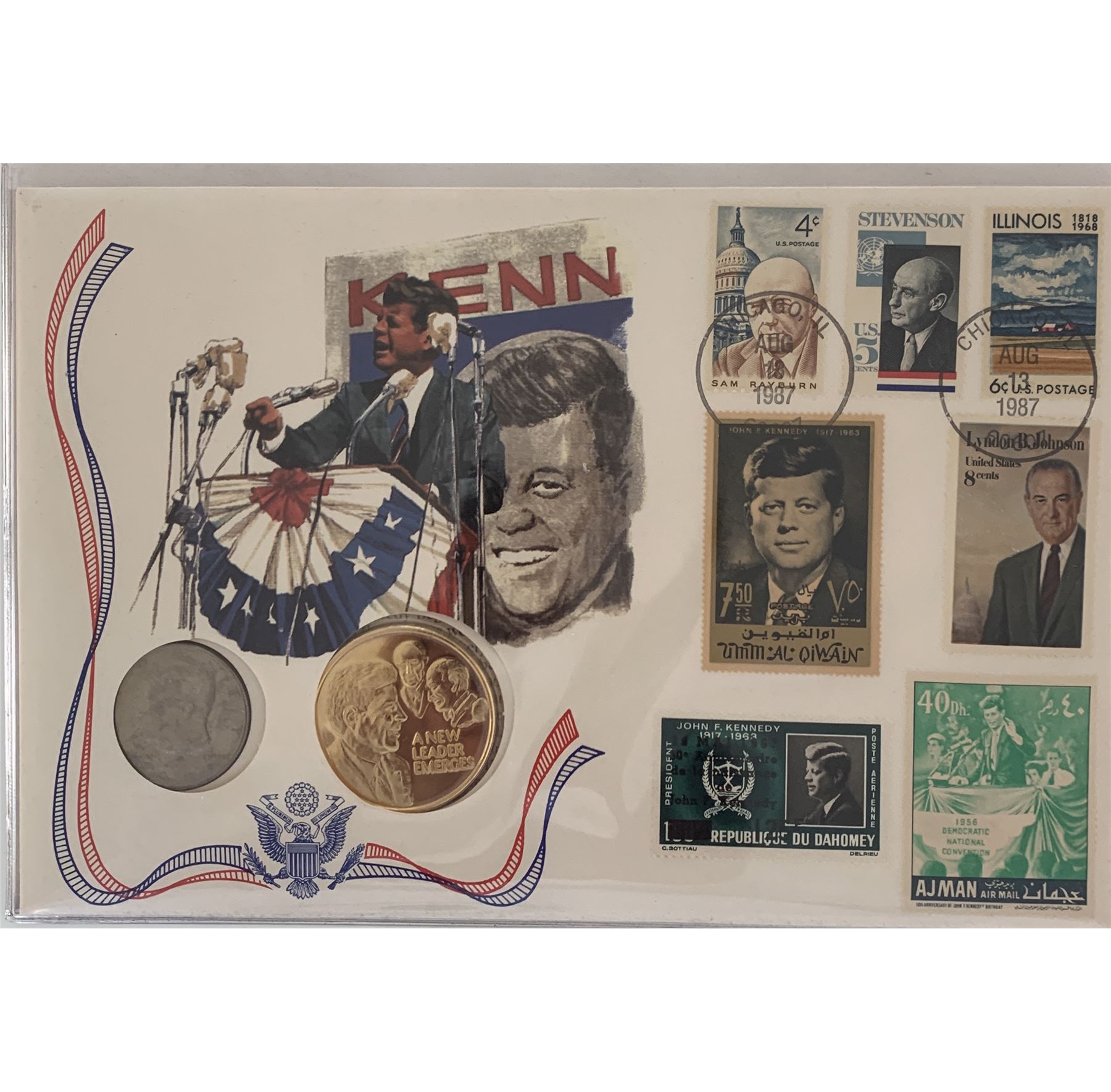 John F. Kennedy commemorative cover featuring artwork, stamps, medallion and uncirculated half dollar. 6x9 inches