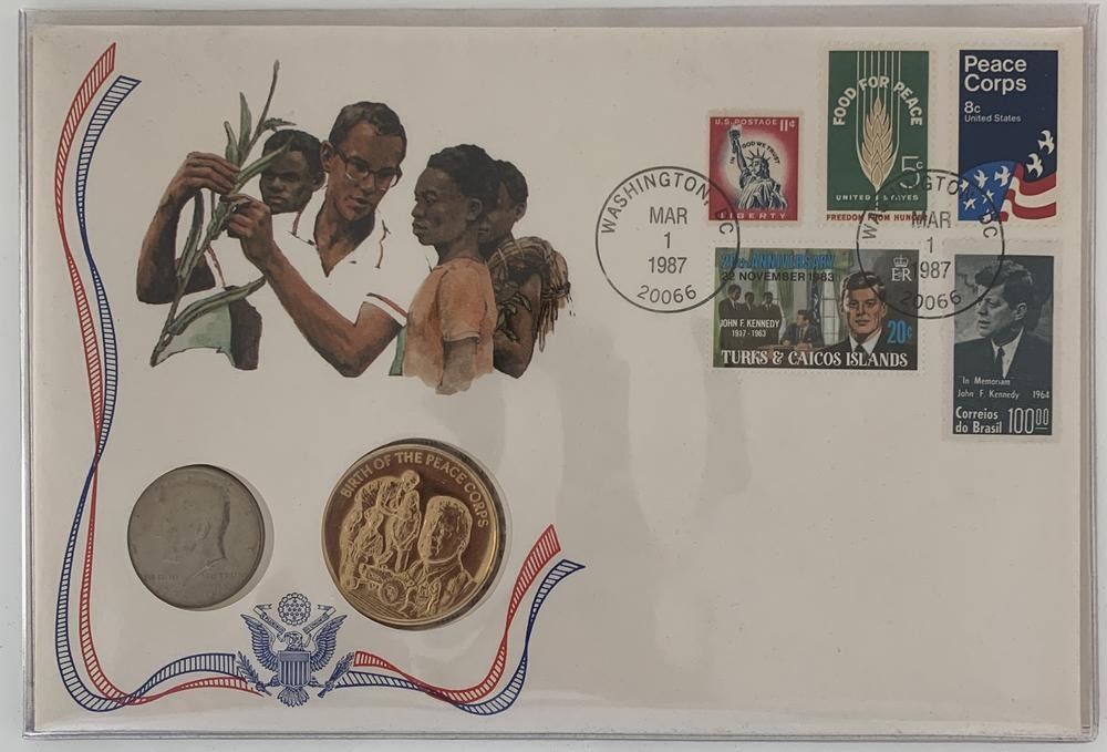 John F. Kennedy commemorative cover featuring artwork, stamps, medallion and uncirculated half dollar.  6x9 inches