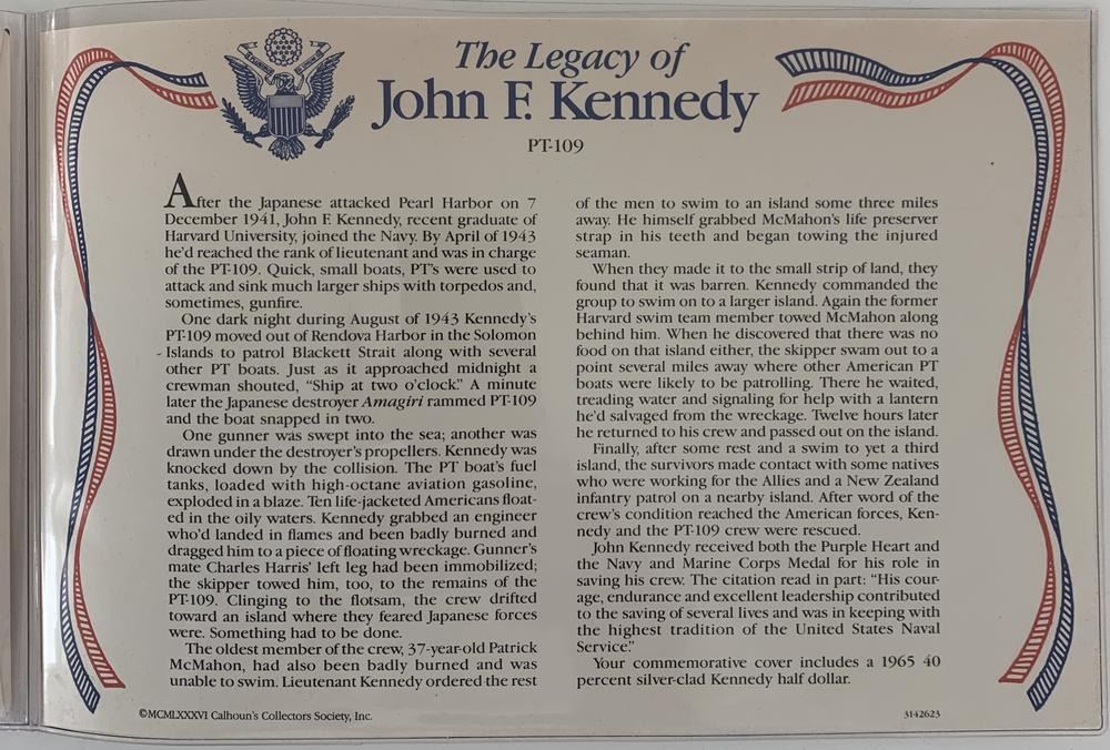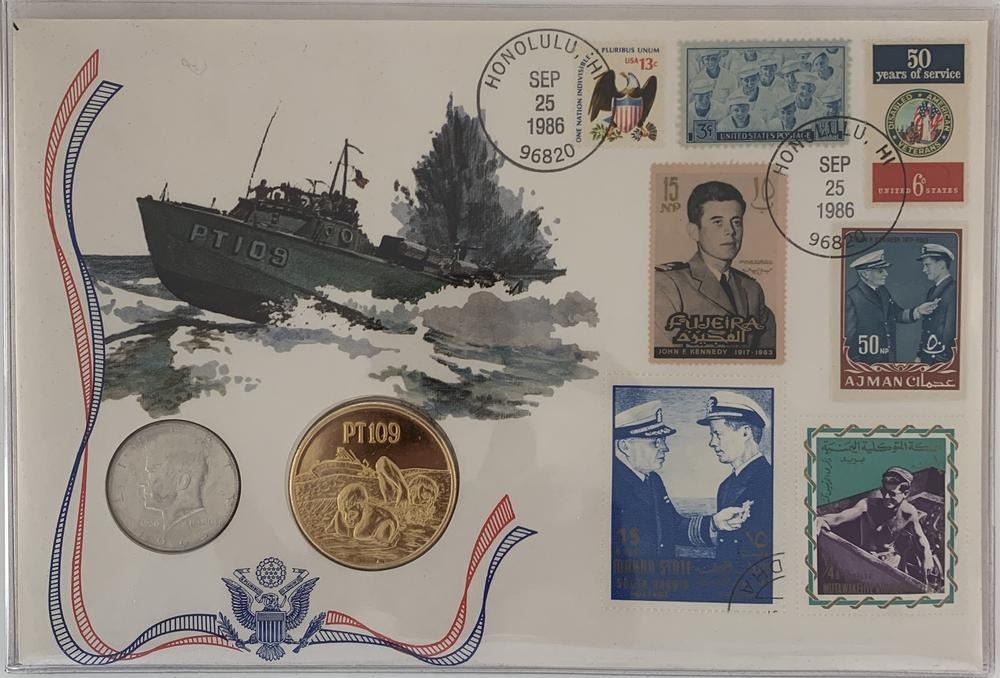 John F. Kennedy commemorative cover featuring artwork, stamps, medallion and uncirculated half dollar.  6x9 inches