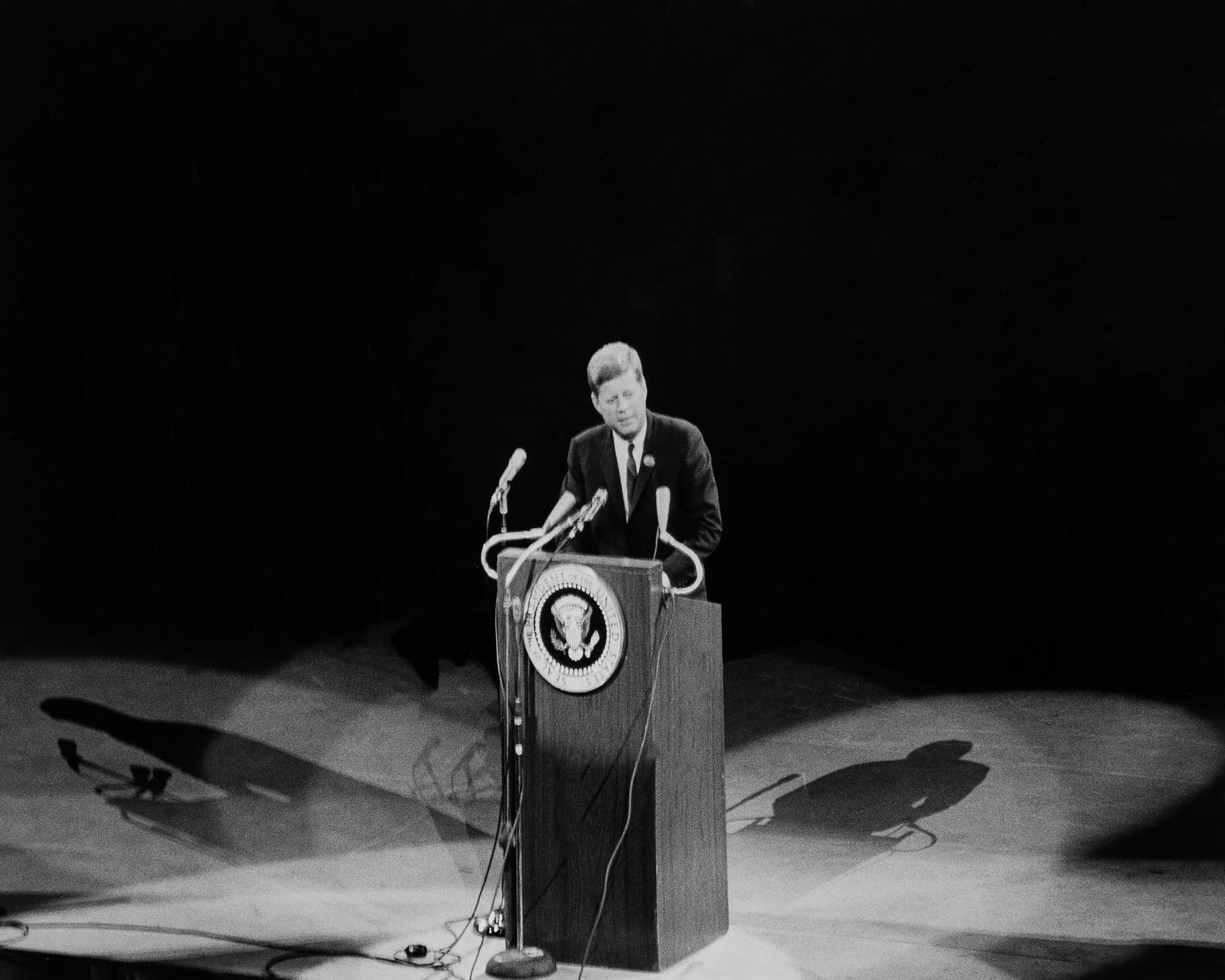 Vintage photo of John F Kennedy on stage on the night of the 19th May 1962. 10x8 inches. Mounted and framed.