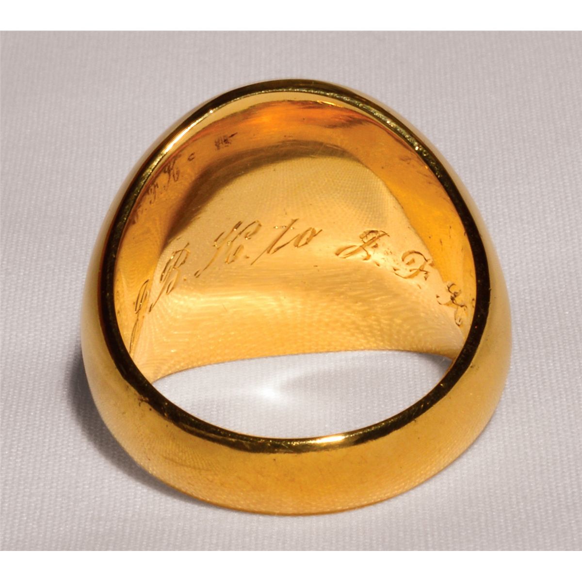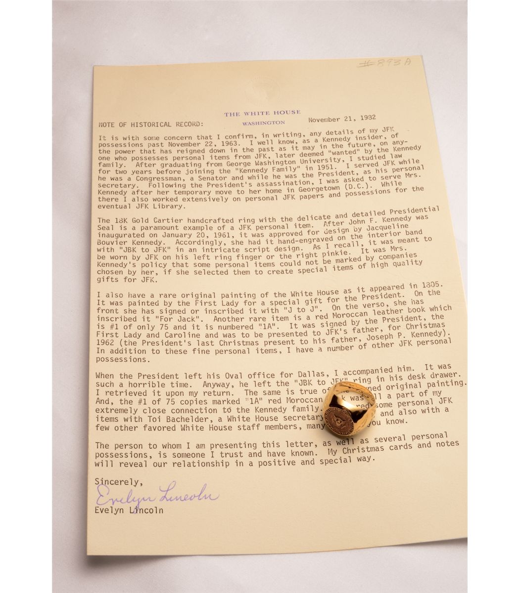 Elegant custom-made one-of-a-kind 18k gold handcrafted ring presented to President Kennedy by his wife Jacqueline in 1963. According to Kennedy’s secretary Evelyn Lincoln it was crafted by Cartier, though due to its being privately made, it bears no official maker’s mark. The 18 karat gold ring bears a detailed engraving of the presidential seal on the outside, and is hand-engraved on the inside, “J. B. K. to J. F. K.” Accompanied by a November 21, 1982 letter of provenance from Kennedy’s secretary Evelyn Lincoln, written on White House stationery, which reads, in part: “The 18K Gold Cartier handcrafted ring with the delicate and detailed Presidential Seal is a paramount example of a JFK personal item. After John F. Kennedy was inaugurated on January 20, 1961, it was approved for design by Jacqueline Bouvier Kennedy. Accordingly, she had it hand-engraved on the interior band with ‘JBK to JFK’ in an intricate script design. As I recall, it was meant to be worn by JFK on his left ring finger or the right pinkie. It was Mrs. Kennedy’s policy that some personal items could not be marked by the companies chosen by her, if she selected them to create special items or high quality gifts for JFK…When the President left his Oval Office for Dallas, I accompanied him. It was such a horrible time. Anyway, he left the ‘JBK to JFK’ ring in his desk drawer. I retrieved it upon my return.” A beautifully crafted and deeply personal gift from the First Lady. In fine, near mint condition. Provenance: The Raleigh DeGeer Amyx Collection.