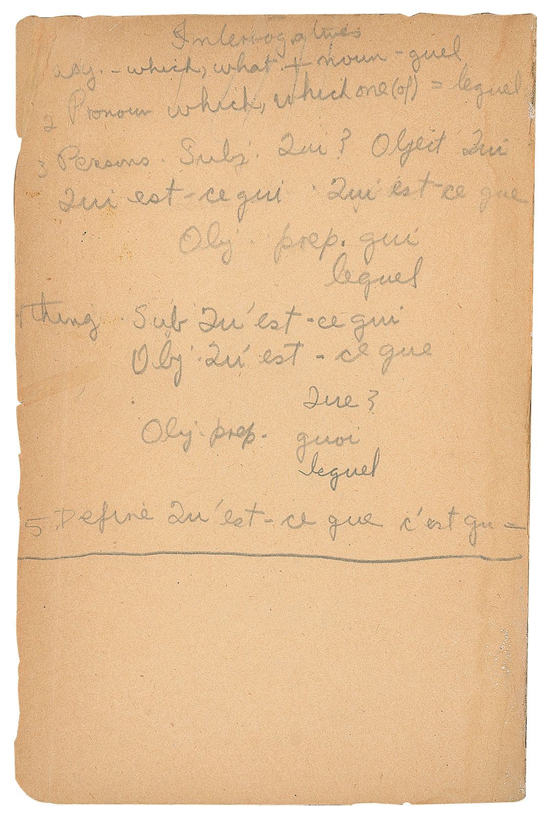 Handwritten highlights include Jack Kennedy's French interrogatives in his handwriting, 77 partial and full signatures by JFK (including a full "John Francis Fitzgerald Kennedy" on page 267, probably the only such signature extant), JFK's drawing of “Le Pantheon A Paris,” Kennedy writing his name and family address (Kennedy John F., 294 Pondfield Rd, Bronxville, NY"), one of the earliest extant drawings from JFK's vivid imagination at 14 years of age: a smiling and happy face in the sky above La Porte St. Denis in his textbook, his signature 12 times on one page alone, and another witty warning: "Jack Kennedy, Choate House, Room 101, Choate, Drop this book!! This book is not an orphan, do not adopt it."