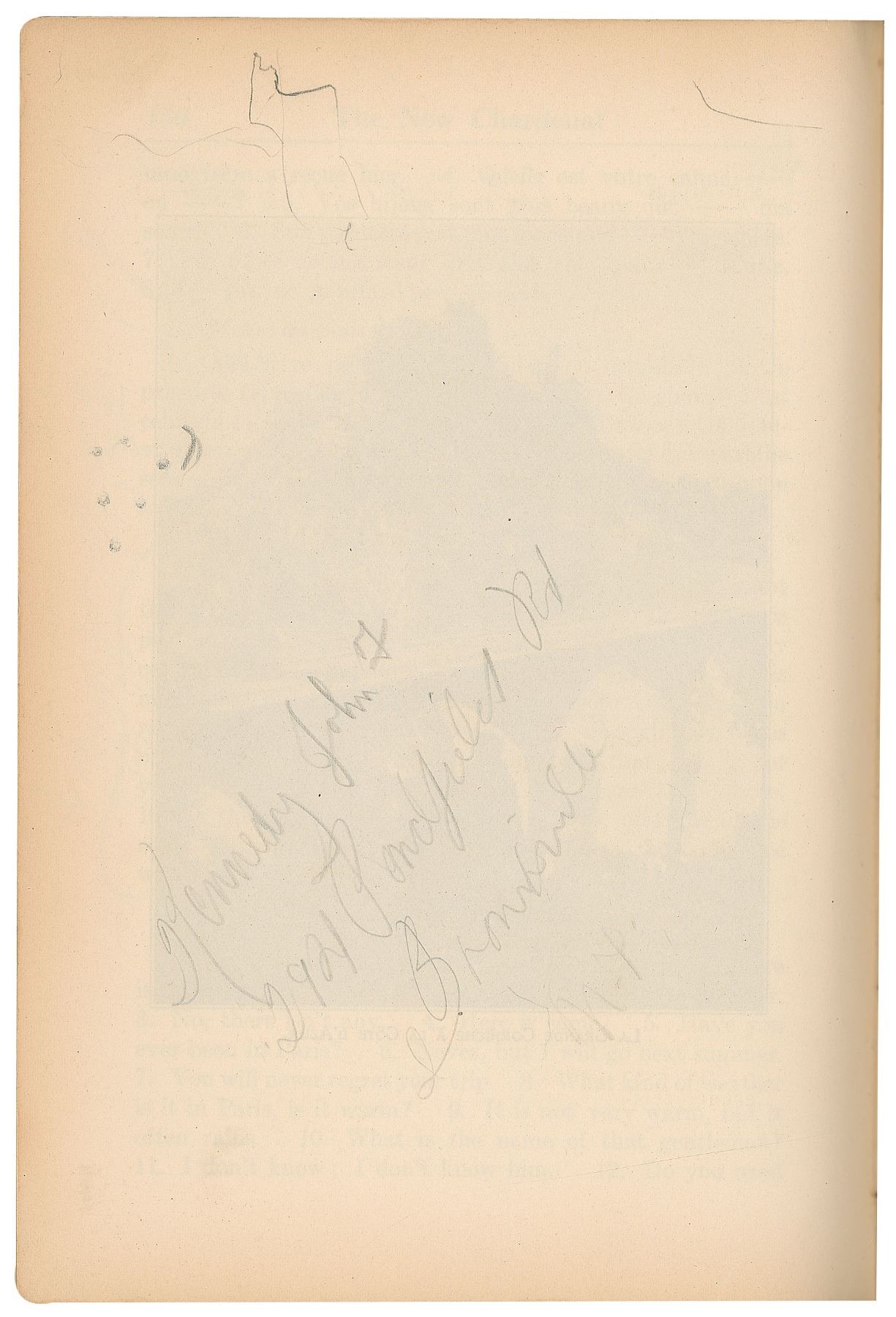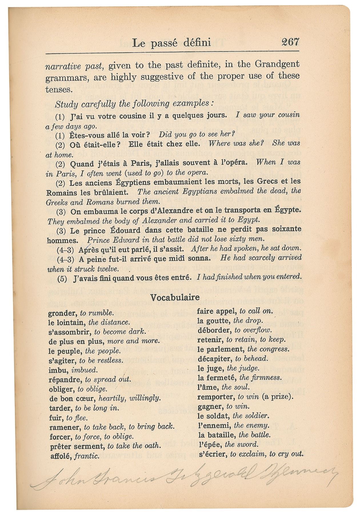 John F. Kennedy's 1931 French textbook: "The New Chardenal," signed in ink by Jack Kennedy and by his older brother Joe Kennedy. Used by JFK as a 14 year old in his first year at Choate, with an incredible 77 partial and full signatures by JFK, with many variations, doodles, and homework assignments. Clever statements on the front and back pages from JFK warn against stealing his book, stating in pencil below Choate’s address, “This book is not an orphan, do not adopt it.” This is the first of many examples in this collection displaying JFK’s great wit and sense of humor.