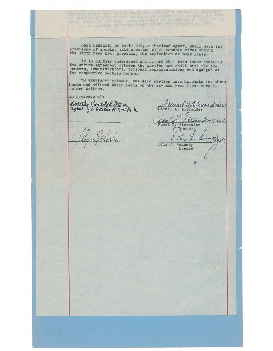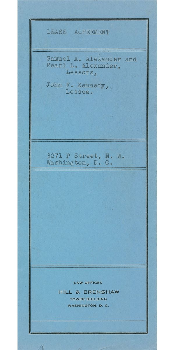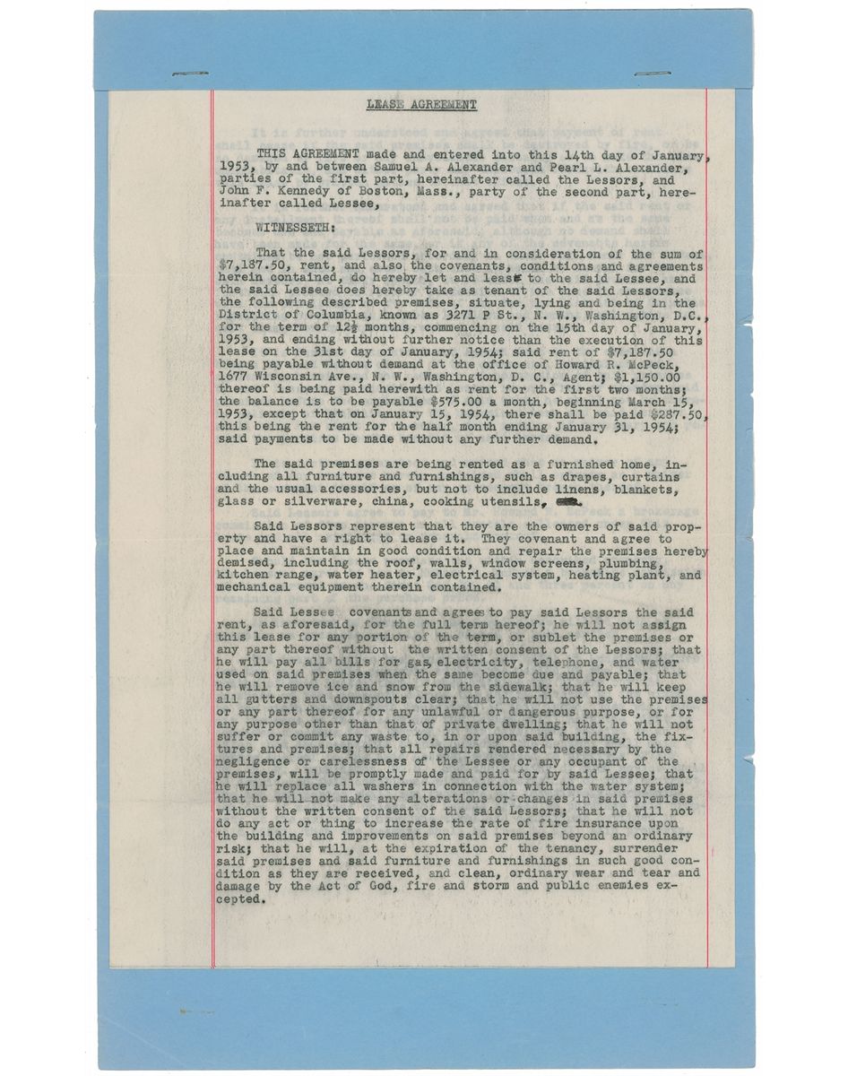 DS three pages, 8.5 x 13, January 14, 1953. A 12.5 month lease agreement between Senator Kennedy and Samuel and Pearl Alexander for a property located at 3271 P Street, NW, Washington, DC, for a monthly rate of $575, commencing on January 15, 1953. Included in the residence were “all furniture, furnishings, such as drapes, curtains and the usual accessories, but not to include linens, blankets, glass or silverware, china, cooking utensils, etc,” leased by the Lessors who agreed to “maintain in good condition and repair the premises hereby demised, including the roof, walls, window screens, plumbing, kitchen range, water heater, electrical system, heating plant, and mechanical equipment therein contained,” signed at the conclusion by Kennedy, both of the Alexanders, and two others. The contract is housed in its original, slightly larger blue legal folder and is in fine condition, with light brushing to the “F” in Kennedy’s signature.