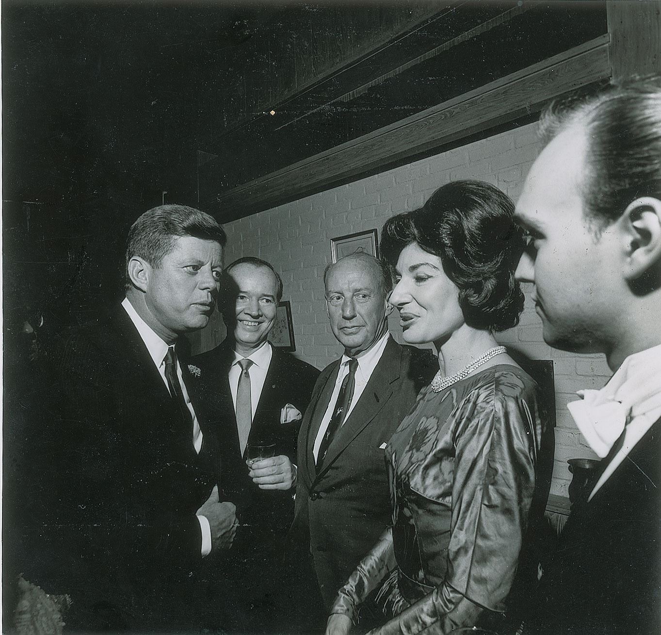 Cecil Stoughton's own original glossy 7.5 x 7.5 silver gelatin photo of John F. Kennedy visiting with opera singer Maria Callas at the Krim residence following his famed 1962 Madison Square Garden birthday party, taken by official White House photographer Cecil Stoughton and kept as his personal file copy, with his address label on the reverse. Also seen in the image is Adlai Stevenson, at center. Reverse bears "This Paper Manufactured by Kodak" watermarks (indicating that it was printed later), a caption, and an affixed Cecil Stoughton address label. In very good to fine condition, with areas of light silvering. From the collection of Cecil W. Stoughton.
