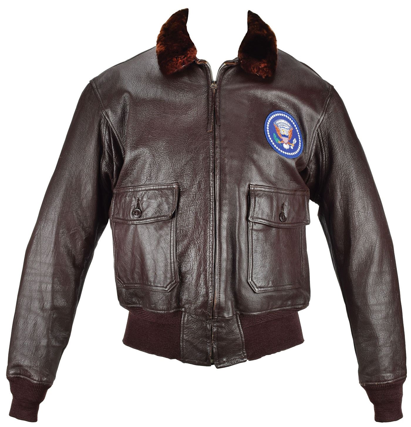 President John F. Kennedy's dark brown leather G-1 Bomber jacket manufactured by L. W. Foster Sportswear for the USN Bureau of Aeronautics, size 44, with front flap pockets, fur collar, wool ribbed knit cuffs and waistband, and left chest bearing an embroidered patch of the presidential seal. The lower portion of the interior zipper lining perforated with “USN,” and the manufacturer tag issued as “Contract No. DA-36-243-QM (CTM) 2134.” President Kennedy had this handsome jacket tailored to fit his frame prior to its purchase in December 1962. In fine condition, with expected wear from use. From the family estate of Henry E. Hirschy.