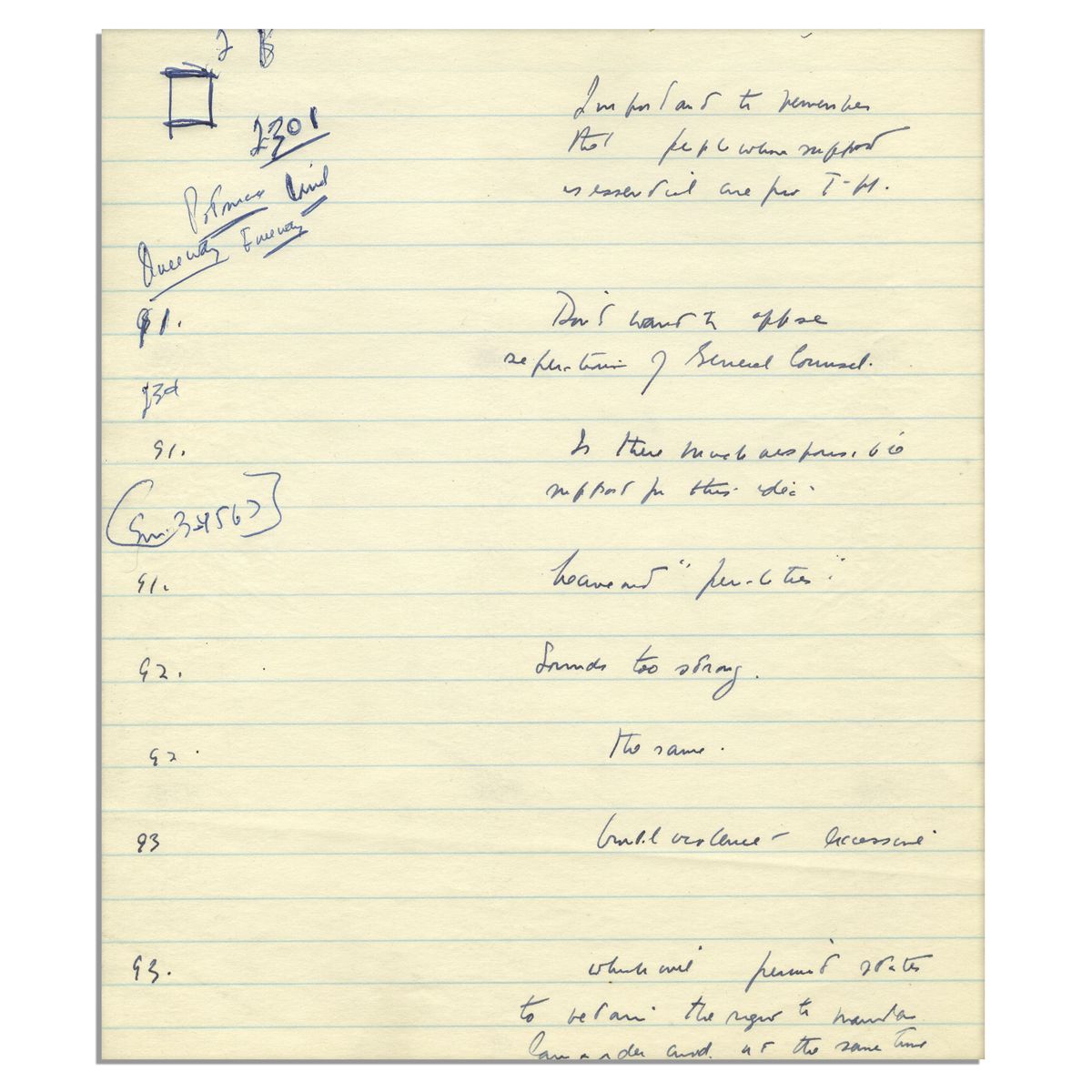 John F. Kennedy handwritten notes as a Massachusetts Senator on official ''United States Senate'' letterhead. Circa May 1953, JFK writes on lined tablet paper regarding a variety of economic issues. At the time of these notes, Kennedy spoke extensively on labor law, unionization and the minimum wage. Page is numbered along the left side, corresponding to eight handwritten notes on the right side, such as ''Sounds too strong'' and ''Important to remember that people whose support is essential are pro T-H [Taft-Hartley]''. He also writes various numbers and doodles at top left. Single page measures 8'' x 10.5''. Very good condition with minor toning throughout. Originally part of lot 188 of the Guernsey's 1998 JFK sale.