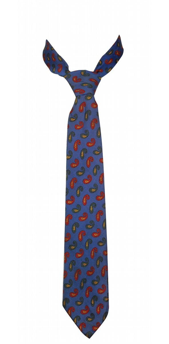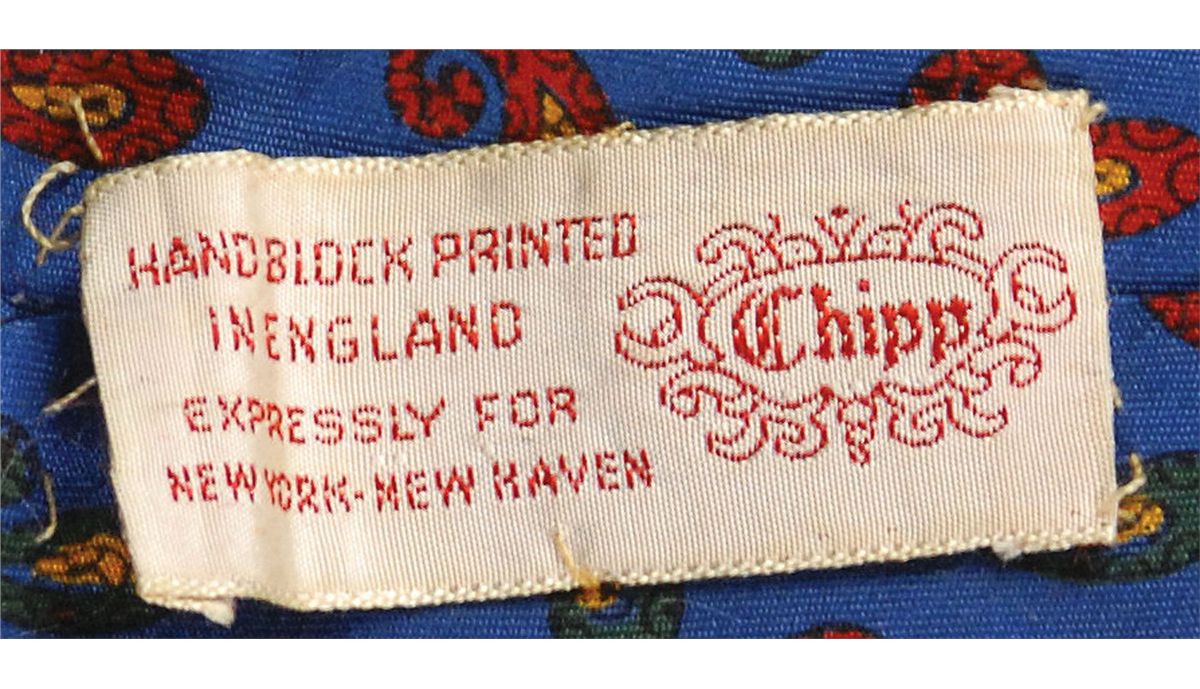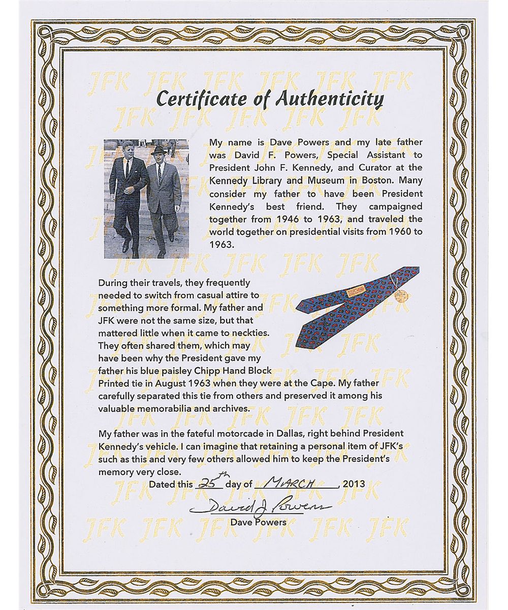 One of John F. Kennedy’s personally-owned and-worn neckties. Blue, red, and black paisley hand block printed tie bears a Chipp maker’s label on the underside. Accompanied by a copy of a letter of authenticity from David J. Powers, the son of Kennedy’s special assistant David F. Powers, which states, “They often shared them, which may have been why the President gave my father his blue paisley Chipp Hand Block Printed tie in August 1963 when they were at the Cape. My father carefully separated this tie from others that were his alone and preserved it among his valuable memorabilia.” In fine condition.