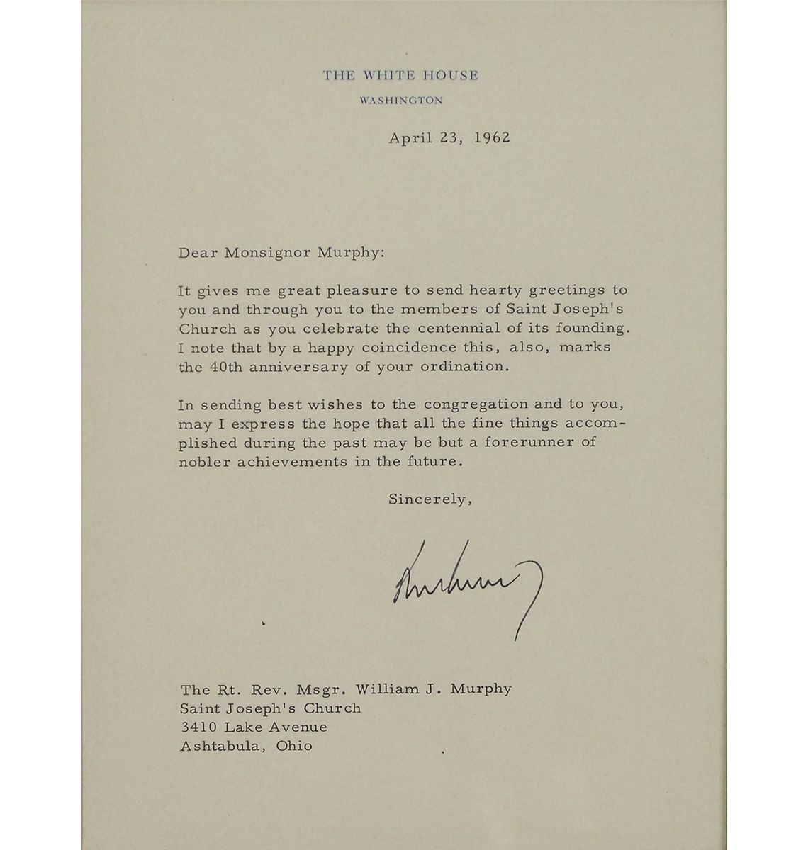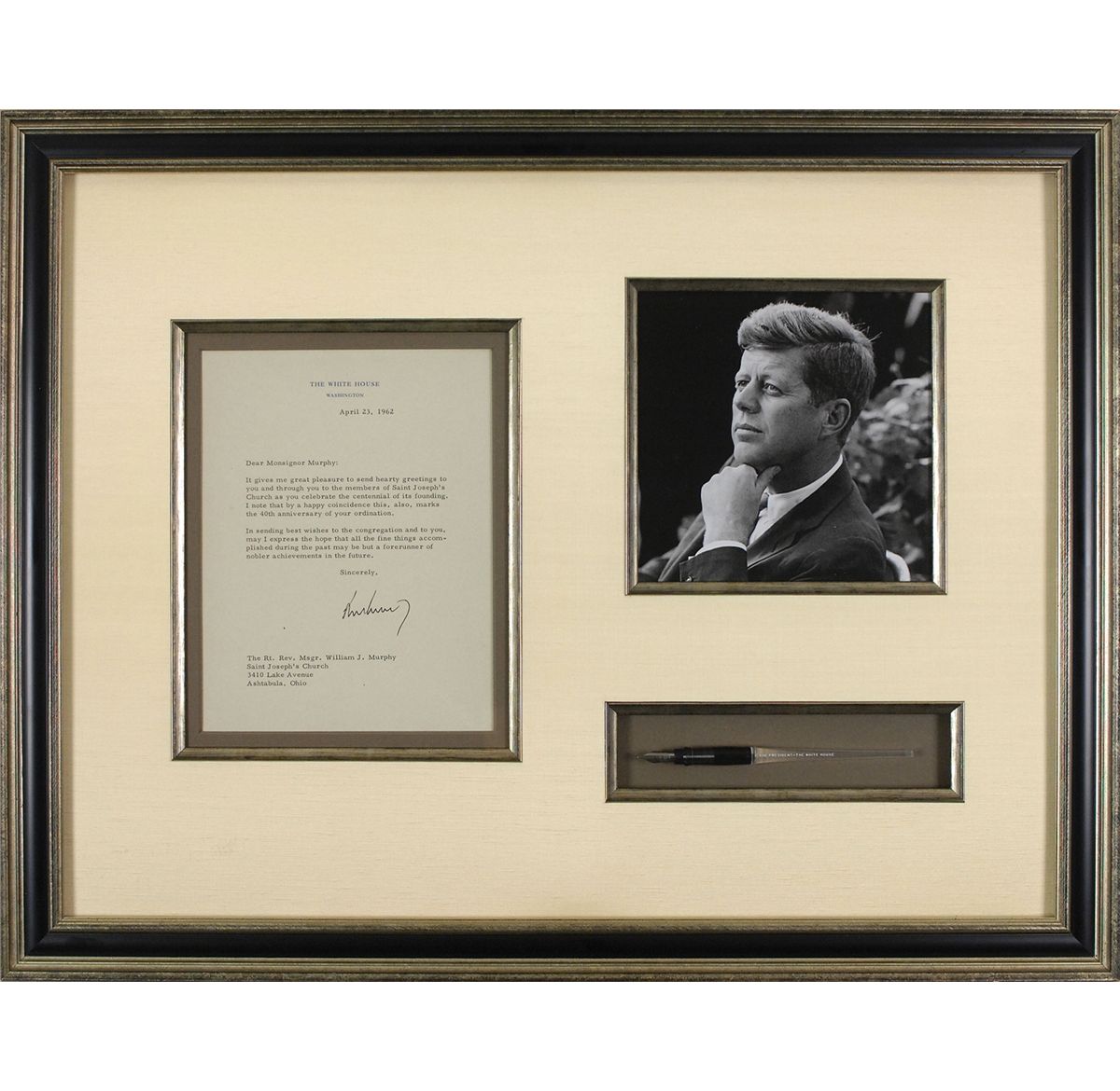 Also included is a TLS, signed as president, one page, 6.5 x 8.5, White House letterhead, April 23, 1962. Letter to Rt. Rev. Msgr. William J. Murphy of Saint Joseph’s Church reads, in full: “It gives me great pleasure to send hearty greetings to you and through you to the members of Saint Joseph’s Church as you celebrate the centennial of its founding. I note that by a happy coincidence this, also, marks the 40th anniversary of your ordination. In sending best wishes to the congregation and to you, may I express the hope that all the fine things accomplished during the past may be but a forerunner of nobler achievements in the future.” Both the pen and letter are nicely cloth-matted and framed with a portrait of Kennedy to an overall size of 25.25 x 20. In fine condition. After first introducing the bill to create the Peace Corps in 1957, Humphrey played a key role in pushing Kennedy’s bill through the Senate; this pen is an exceptional token of appreciation from the president for his persistence.