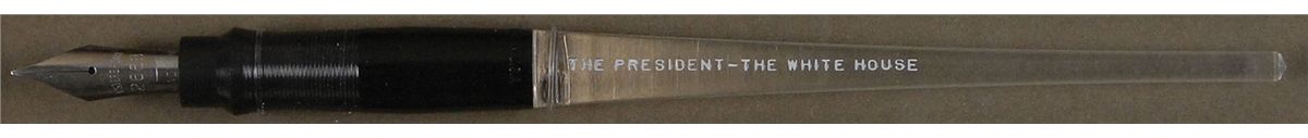 Presidential Lucite and black plastic Esterbrook fountain pen measuring 6” long, with “The President—The White House,” printed on the clear portion of the pen. Pen comes with its original cardboard box which is labeled in blue ink, “Humphry” [sic], along with “HR7500 87293 P.L.,” the identification numbers assigned to the bill and law, all most likely done in a White House employee’s hand. Pen was originally housed in the collection of William H. Perkins, Jr. Perkins served on Presidential Inaugural Committees in 1961, 1965, 1969, and 1973. He was a lifelong lobbyist, first for Continental Casualty where he arranged the insurance coverage for President Kennedy’s inauguration. In 1964, he was appointed by President Johnson as a member of the National Armed Forces Museum Advisory Board of the Smithsonian Institution; he was reappointed by Presidents Richard Nixon, Gerald R. Ford, Jimmy Carter, and Ronald Reagan.