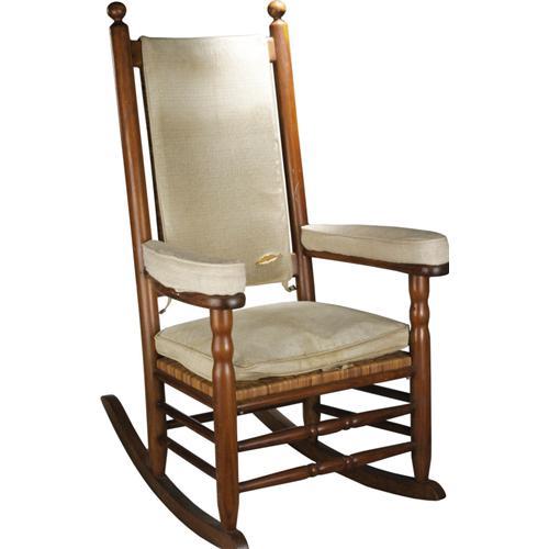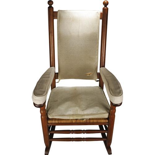 <B>President John F. Kennedy's Personal Rocking Chair from his White House Bedroom.</B></I> John F. Kennedy suffered from well-documented back problems, which led him in 1954 to consult Dr. Janet Trevell in New York City. Trevell recommended the use of a rocking chair, and allowed Kennedy to try the one she used for personal back relief in her own office. JFK liked the chair so much that he ordered an identical one, from the P & P Co. of Asheboro, North Carolina. Over the years, he bought or was gifted approximately 14 virtually identical chairs from that maker for use in the Oval Office, on Air Force One, in his suite at New York's Carlisle Hotel, in his White House bedroom, and other documented locations. Chairs from the presidential years may be distinguished by the unique upholstery added by official White House upholsterer Larry Arata, who used thick arm pads and seat cushion (the chair offered here still has the original Arata upholstery). <BR><BR>It is well documented that Mrs. Jacqueline Kennedy gave the rocker from Jack's White House bedroom to his longtime valet George Thomas in December 1963. Jackie's longtime personal secretary, Mary Barreli Gallagher, wrote poignantly of the event in her 1969 memoir <I>My Life with Jacqueline Kennedy</B></I> (New York: David McKay Co., 1969). She was helping Mrs. Kennedy apportion various highly personal mementos among the late president's close associates, and notes that Mrs. Kennedy assigned the rocking chair from the White House bedroom to Thomas, telling Gallagher, "It was always in his (JFK's) bedroom. I know he would want (George) to have it." (p. 339). <BR><BR>The chair remained with George Thomas until his death in 1980, and it was subsequently purchased from his family (a notarized letter detailing that transfer of ownership will accompany this lot). Furthermore, some skilled "sleuthing" has clearly established this present chairË