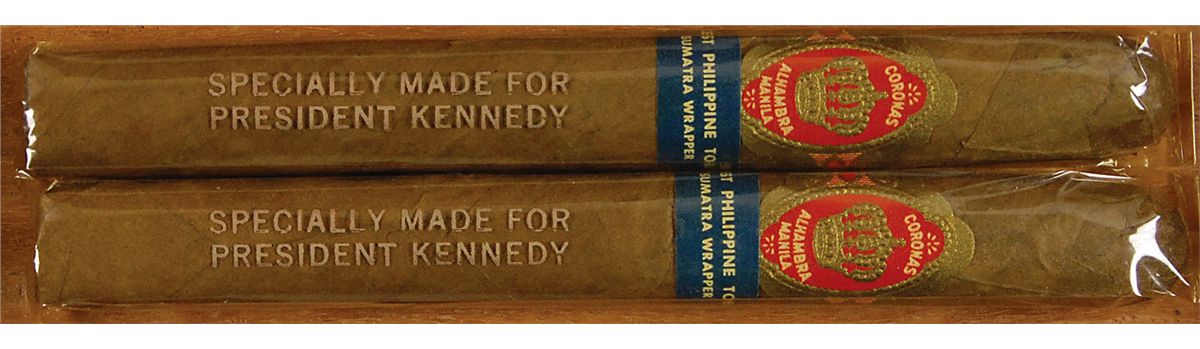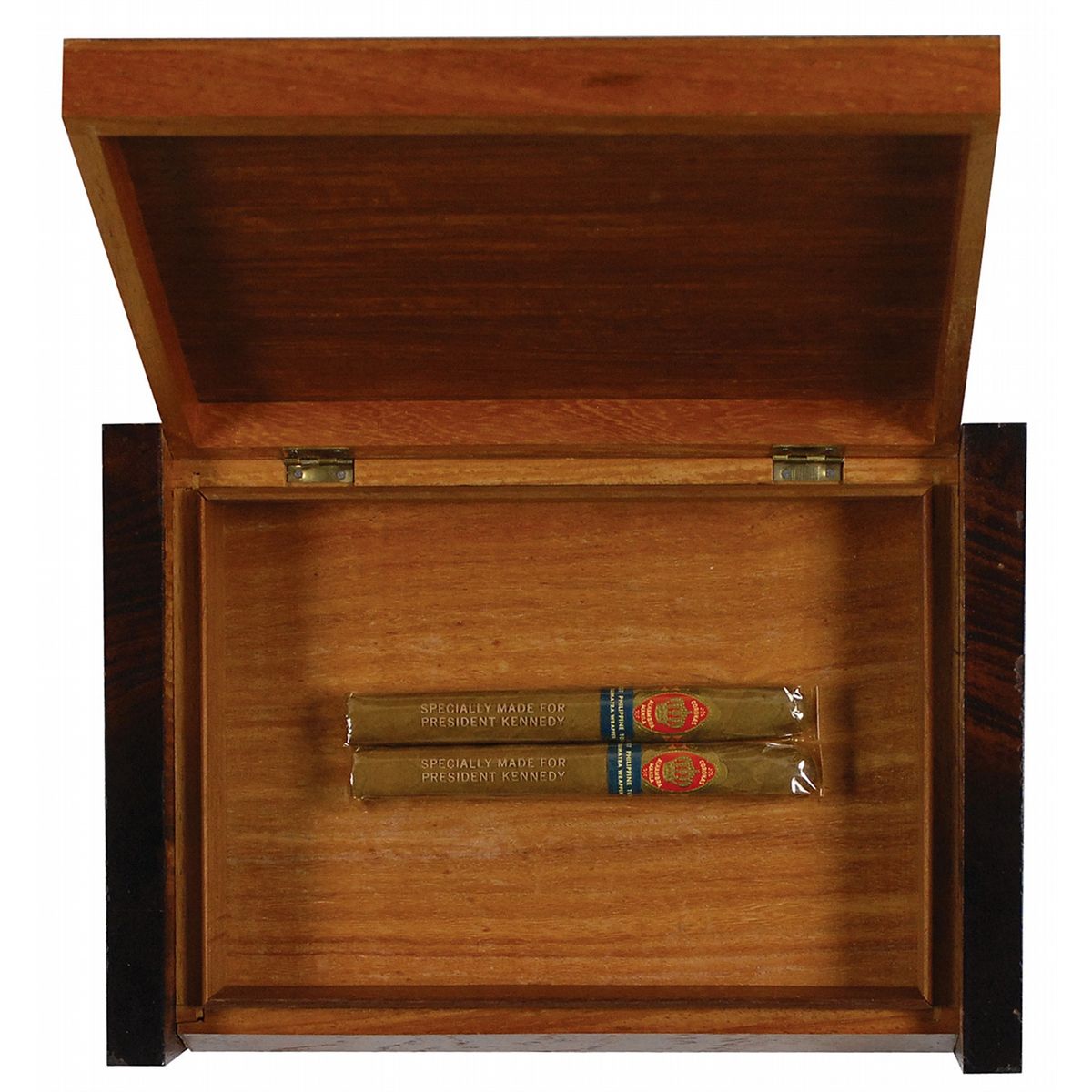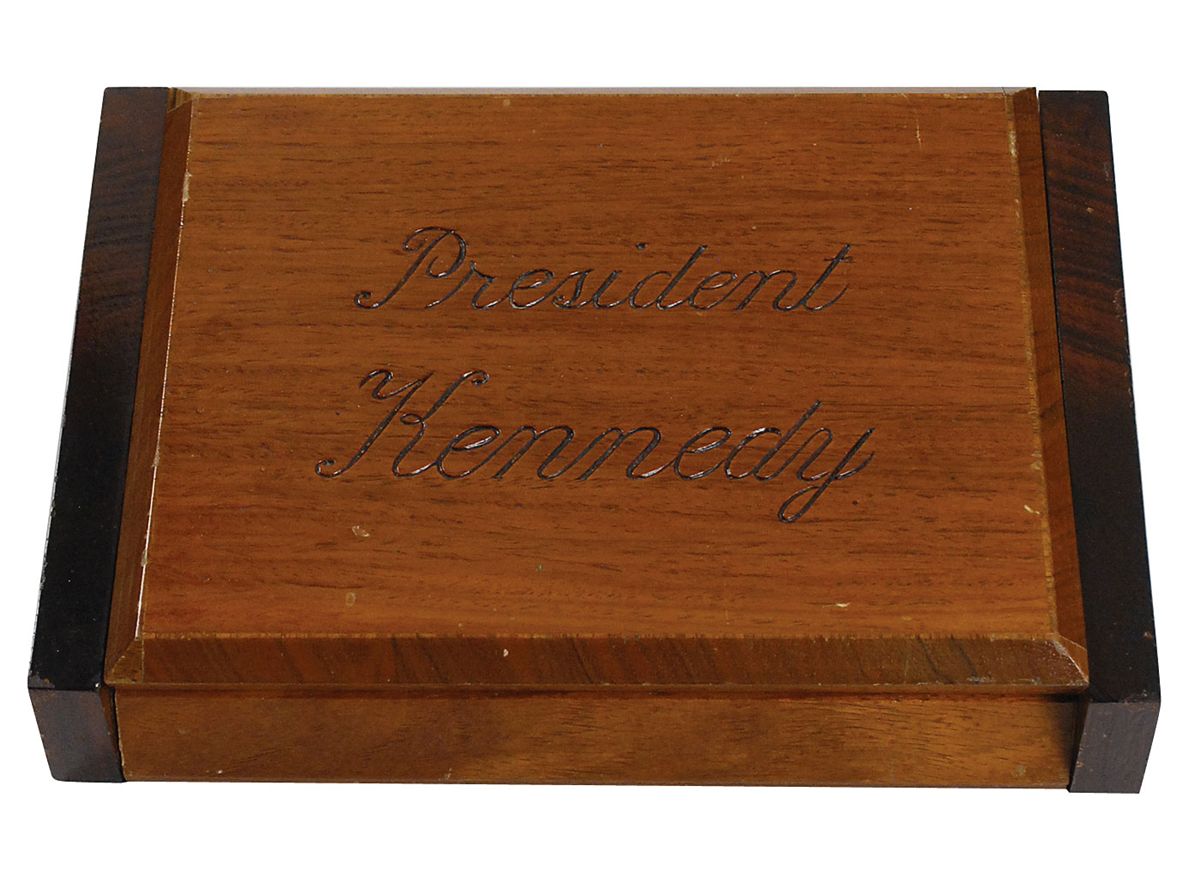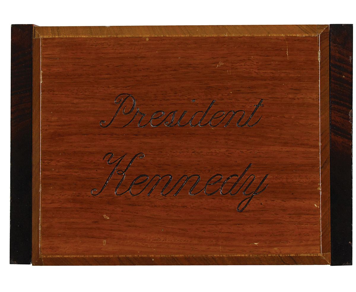 President Kennedy’s personalized wooden humidor. Hinged mahogany humidor is engraved on the lid “President Kennedy,” measures 10.25 x 7 x 2, with a 9.75 x 7 thin sheet of green felt covering most of the bottom of the cigar box. Presented to Kennedy by Philippine Ambassador Amelito R. Mutuc, and was designed to hold a total of 26 cigars, given as a gift to Kennedy. Two unopened cigars are stored inside, each 5.25? long, with “Specially made for President Kennedy,” imprinted on the wrappers, and “Flor Fina Coronas Alhambra Manila Choicest Philippine Tobacco Sumatra Wrapper,” printed on the bands.